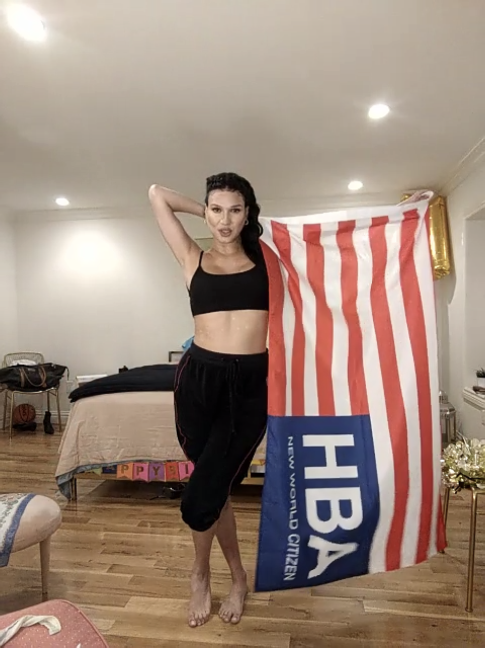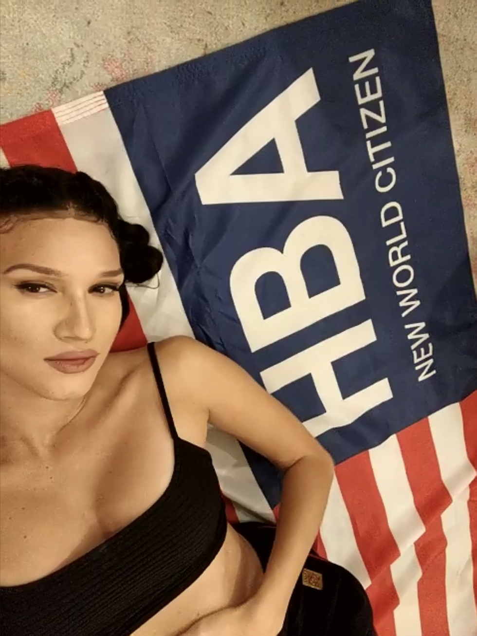 Below, Nomi Ruiz — musician, actress, writer and a self-proclaimed "Renaissance woman" — answers questions provided by HBA Creative Director Shayne Oliver and poses with the "New World Citizen" flag over Zoom for Full Tac.
