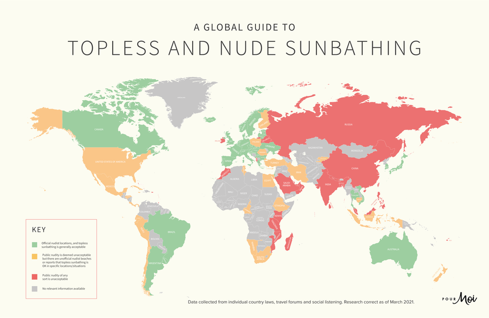Thanks to UK swimwear brand Pour Moi, this map is categorizes countries into four colors: Green, orange, red and gray. Where it's green, you can sunbathe nude; in orange areas, rules are unclear; in red zones, it's illegal to do so and some countries have strict punishments; and in gray, there wasn't enough available info to make a decision for the report.