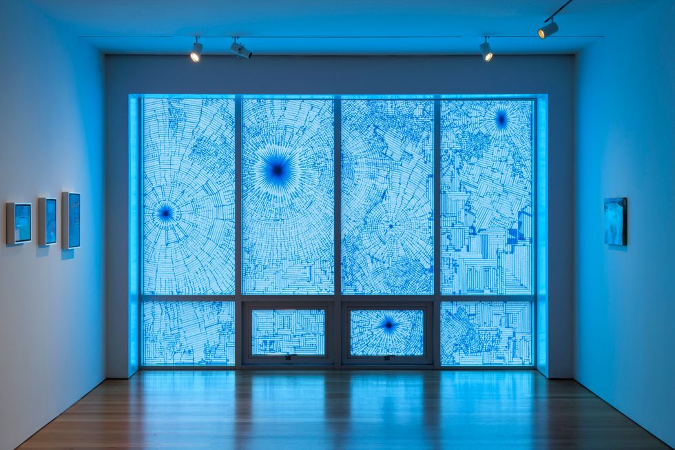 The murky psychedelia of Reggie Burrows Hodges’ “Swimming In Compton 628” (2014) fits the theme more gracefully. It’s a swimming pool as a portal, full of bruised color and suffused with a lovely, conflicted nostalgia. It makes for a nice complement with Melanie Schiff’s hypnotic video a gallery over, which captures the abstract neon churn of nightswimming. The absolute stand-out — which is reason enough to visit the show — is by the late Tony Feher. A floor-to-ceiling mosaic of spidery blue painter’s tape, Feher’s piece resembles the cracked underwater view from a submarine at the bottom of the ocean. The effect is beautiful and doom-laden, like a stained glass window offering up the exact opposite of salvation.