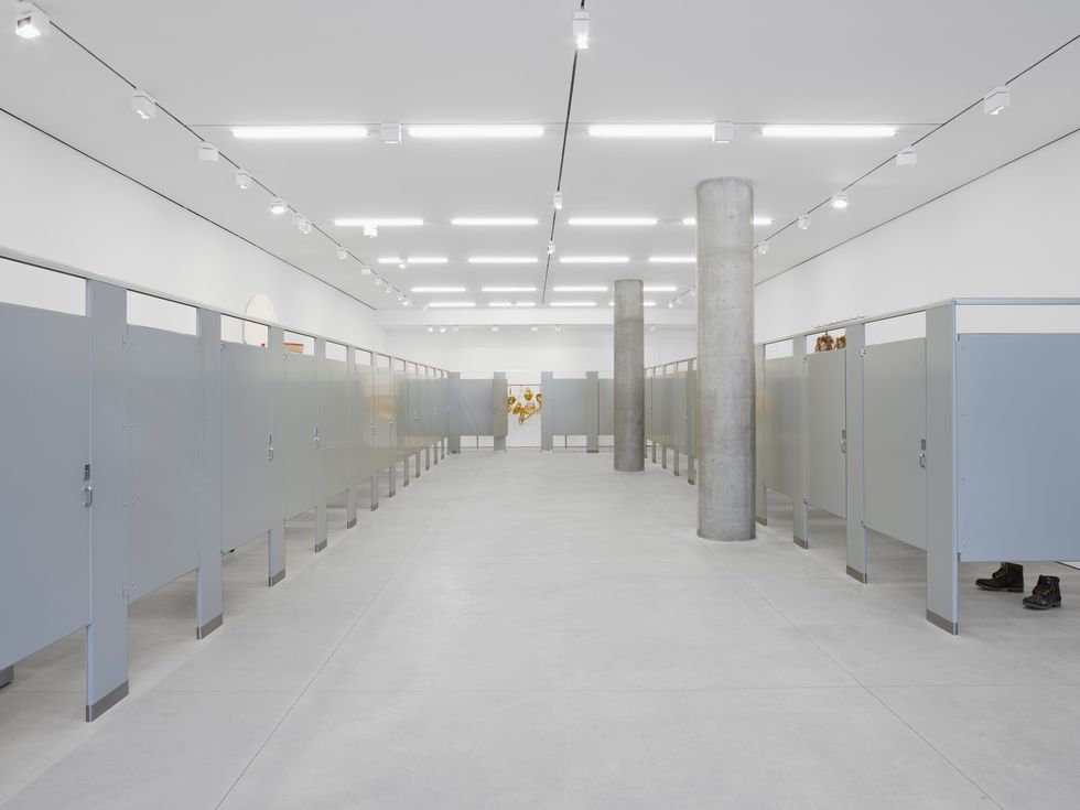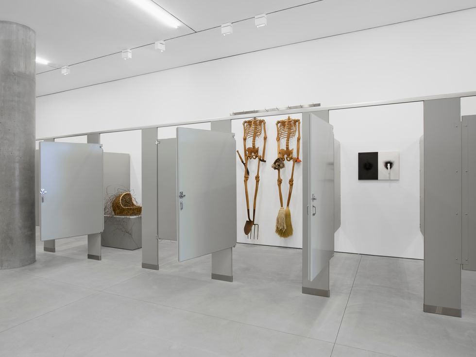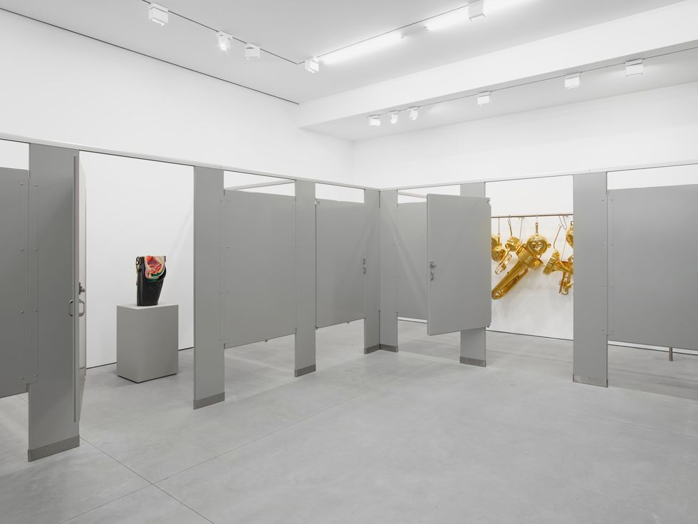 The second show, which is still up and running, is Hughmans by Hugh Hayden: a maze of bathroom stalls, interspersed with peekaboo sculptures, complete with fully functioning urinals. Hayden has a much lighter touch than Cattelan and clearly seems more inclined to make his audience laugh than to hold them hostage. But despite its outward humor, you get the sense that Hayden has his own mixed motives. The press release is oddly cuddly, an academia-inflected bear hug that seeks to “investigate experiences of revelation, intimacy, desire and sexuality — this time through the lens of the collective experience.” But these claims, which frankly make his show sound like touch therapy or a nudist retreat, rarely bear out in his art. Like Cattelan, Hayden seems to want his art to play in both registers: as some kind of sweeping humanist comment and as a series of aggressively stupid one-liners that dare you to take them seriously.