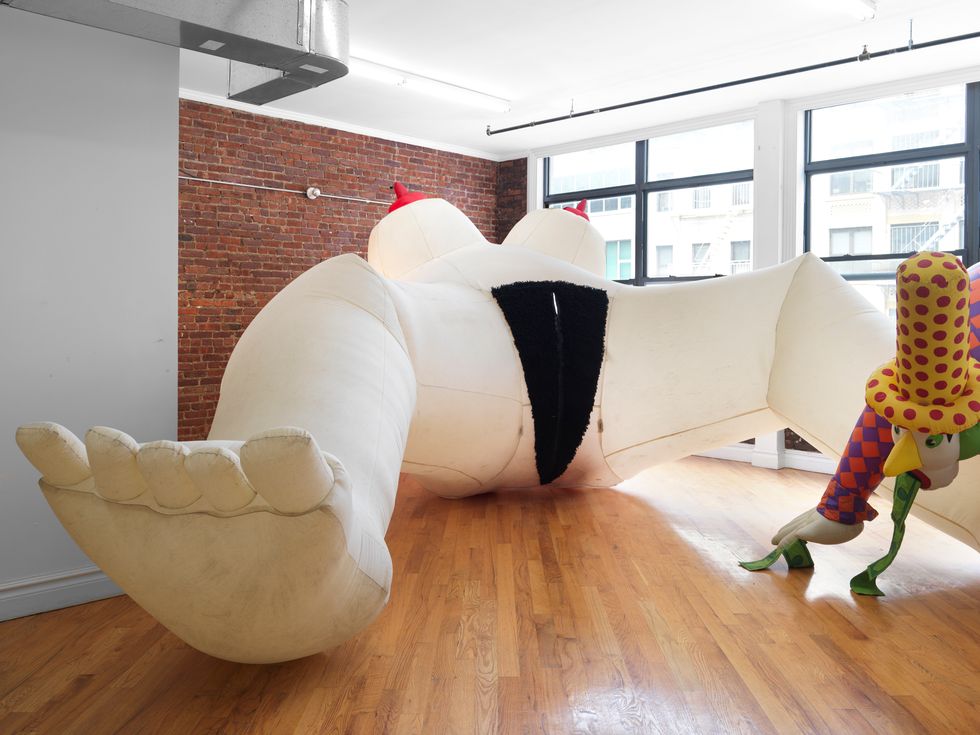 The only pieces that read as slightly dated or stale are the ones that cross over into our recent political landscape. The humor of “A/Bout Dissent” (2014), which recreates a Wrestlemania smackdown between Edward Snowden and Pussy Riot in hat form is a little too timestamped to be funny. It’s likewise difficult to muster much enthusiasm for “Stoke the Vote” (2020), which is admirably flamboyant about the importance of voting, even if it doesn’t do much to diffuse anyone’s apathy with contemporary politics. Some of Oleszko’s strongest work are her inflatables, which ditch the limits of a human anatomy to multiply and super-size body parts into giant pagan totems. “Udder Delight” (1989) is a multi-breasted blow-up deity that’s flanked on both sides by columnar looking ovaries, showcasing the same kind of monumental psychedelic femininity you see in artists like Dorothy Iannone and Niki de Saint Phalle. “Womb With a View” (1990) manages to be even more outsized and crazy: a pathetic little capitalist humping a pair of giant spread legs, which lead to a zip-up vagina engulfing a pitifully small dick. To be truly ridiculous is actually brave and serious business and at her very best Oleszko’s cartoon vision reminds you as much.