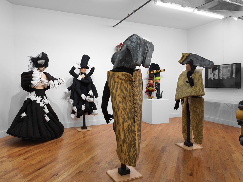 In her first solo show since 1990, Pat’s Imperfect Present Tense collects decades of Oleszko’s hats, accessories, props and costumes as a small encapsulation of her life’s work. The challenge of any show made up predominantly of costumes is how to bring them to life. This is not a problem for Oleszko. Her pieces are so loony and extreme that a great part of the fun is trying to piece together how anyone could wear them at all. “The Padettes of P.O. Town” (1977) is a three-for-one Boogeyman costume that slouches and slinks like a cunty version of “Pink Elephants On Parade,” while “Tree-Angle” (2010) splits the difference between fashion week all-star and elegantly sinister video game boss. Visual and linguistic puns abound. “The Coat of Arms” (1972) and “The Handmaiden” (1975) are quite literally garments made up of disembodied hands that grope and reach across each mannequin’s body. “Knee-o-Fashism: Wendy Wear-With-All and Her Sole Sister, Ms. Trixie” (1986) is a pair of thigh high boots that double as a miniature drag show. Even if pieces like this, “Tom Saw-Yer” and “Mike Hammer” (both only make sense in the context of a performance, their silliness is so fully realized that you kind of have to tap out. Oleszko is a maximalist weirdo in the tradition of Oskar Schlemmer, Leonor Fini, John Waters, Machine Dazzle and PeeWee Herman; anything and everything can be assimilated into her bizarro universe.