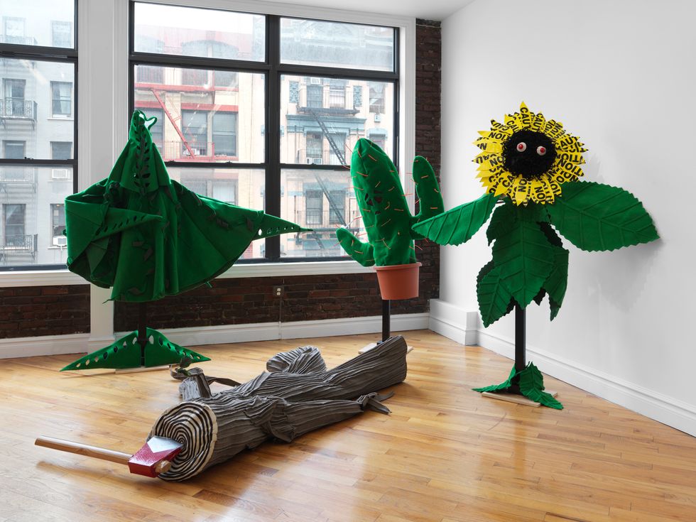 If there’s a crude pleasure to “Sleepover” it immediately diminishes in pieces like “How the West was won” and “Boogeyman” (both 2024), in which he (groundbreakingly) uses dicks and guns interchangeably as symbols of masculinity and violence. These lame visual puns set the show’s ambition to “transform mundane elements into profound symbols'' all the way back to middle school. There’s nothing wrong with a stupid pun — I’m about to praise another show loaded with them! — but Hayden doesn’t take them in any new or interesting directions. Sculptures like “Elvis” and “Uptown, downtown” (both 2024) are fun for their racial and sexual antagonism (the black skyscraper is erect, the white one is limp) but ultimately shoot blank threats. This wouldn’t be a problem if they were materially interesting. Unlike Cattelan, who uses gold and marble to beat you over the head with their preciousness, Hayden is ultra-considerate. He’s an architect and carpenter by training and is so skilled with his hands that he can afford to be poetic and mischievous in his choices. Which is why when he settles for synthetics it feels oddly sterile. Conversely, “American Gothic” (2024) reminds you how good he can be: a riff on the Grant Wood painting, Hayden chops off the characters’ heads and replaces them with mops and brooms, reducing them (in a horrible modern twist) purely to their capacity for work.