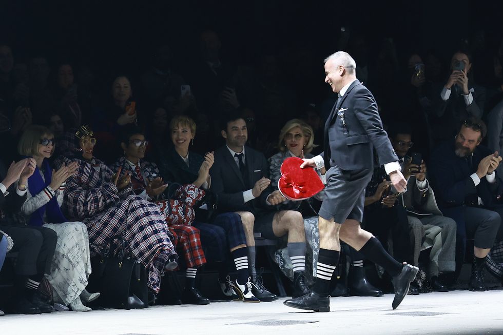 After another theatrical show filled with larger-than-life characters and storytelling, Thom Browne came out for his finale bow and walked bashfully toward his partner Andrew Bolton (head curator of the Met's Costume Institute), gifting him a big red heart-shaped box of chocolates on Valentine's Day. The gesture elicited adoring aww's from the audience who by that point may have forgiven the late 40-minute start (Erykah Badu was late) and 35-minute run-time. We love love!