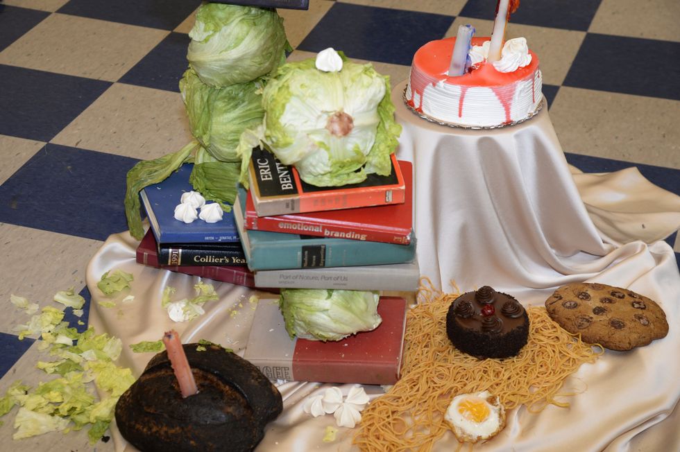 Cuisine and fashion collided at the Fall 2023 Puppets and Puppets show. The collection gave school cafeteria vibes with a blue and white checkered floor and stacks of old books and food concoctions (including noodles, cakes, fried eggs) all designed by Quori Theodor. Following the cuisine theme, cookie purses, banana-handle bags and an egg bra were all featured on the runway.