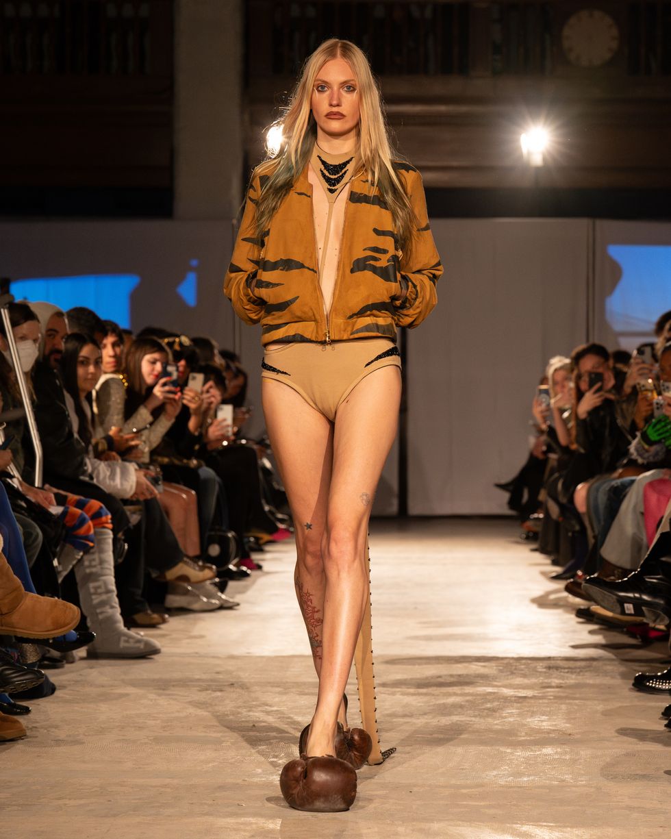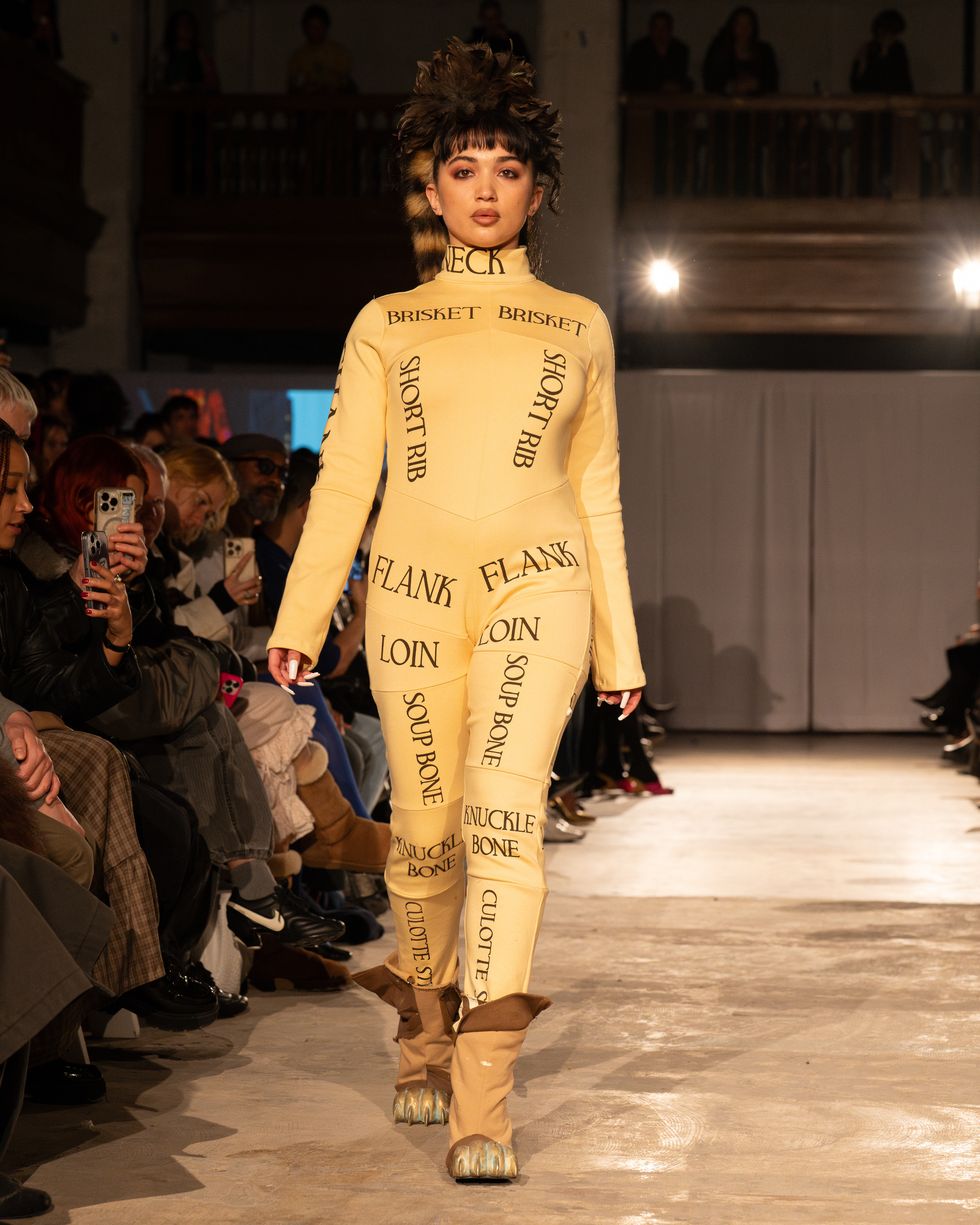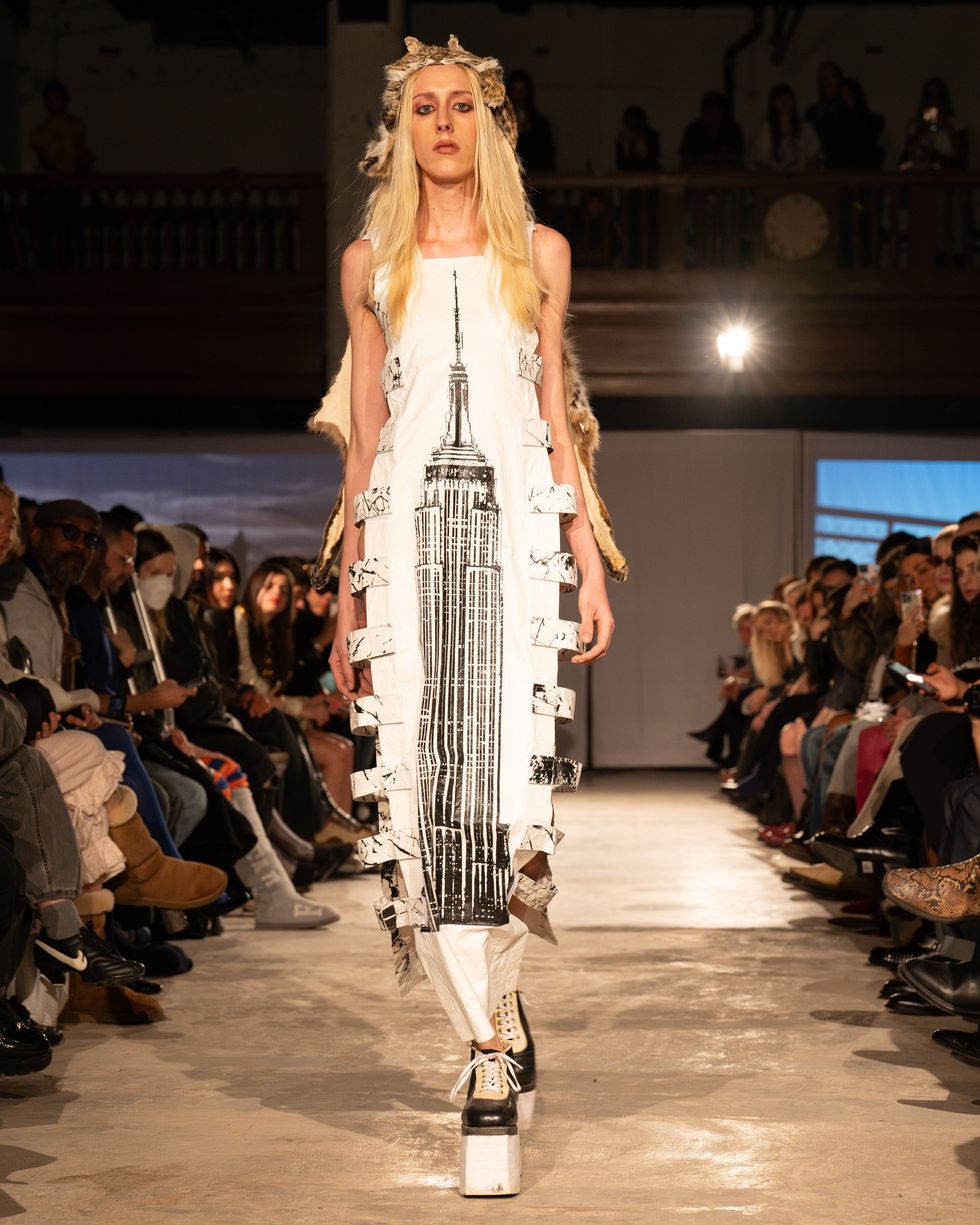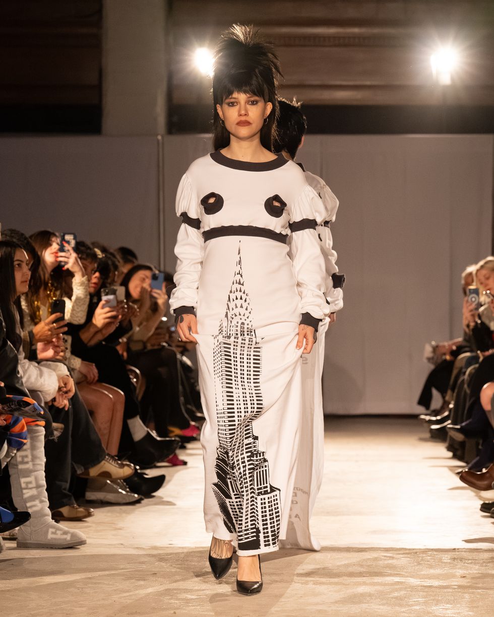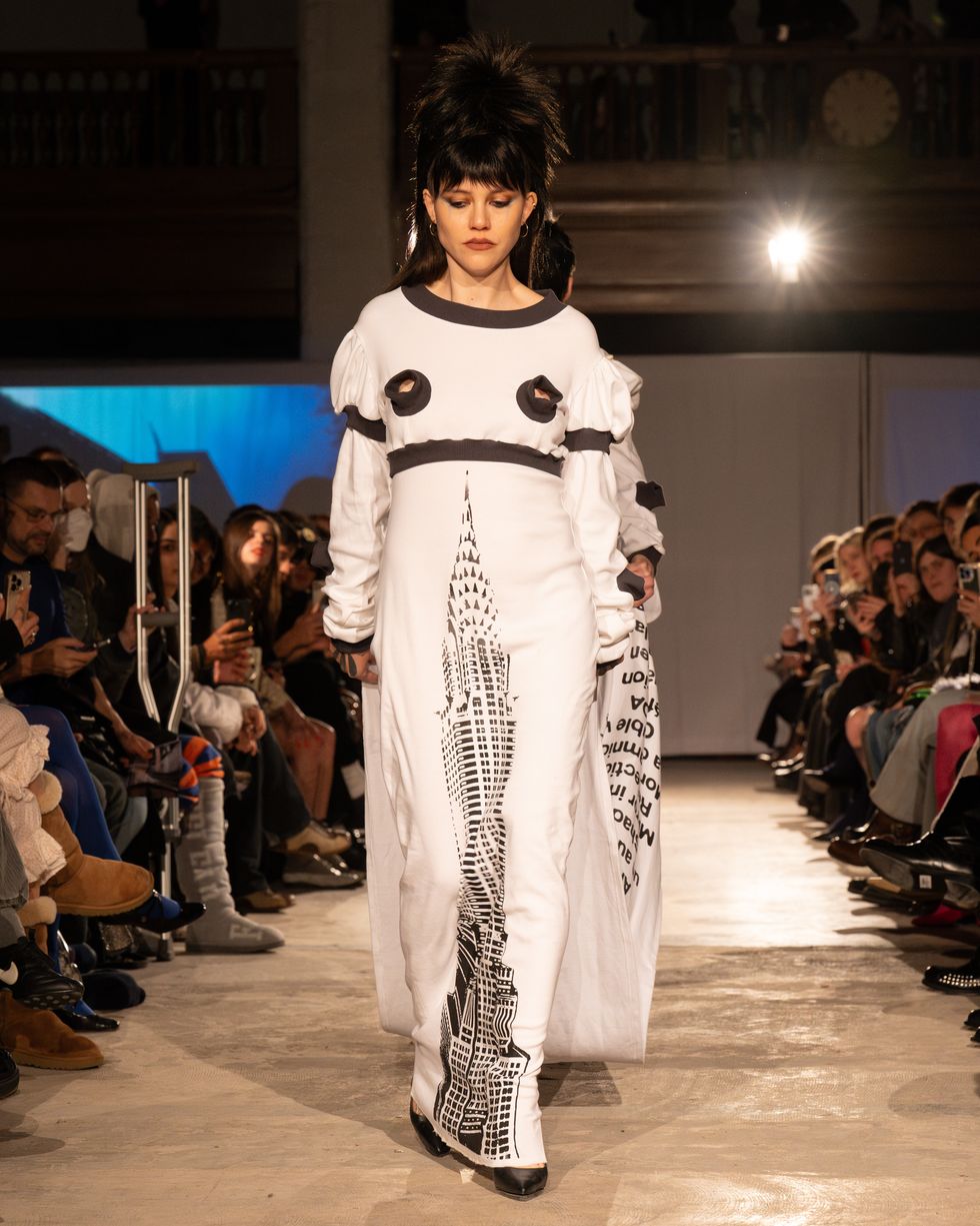 Their Fall 2024 show, entitled "Enfer" ("hell" in French), was a manifestation of this titular taste level. Held in a spotlit enclave across from the New York Stock Exchange, it featured some of the most interesting and exciting looks this season. Brand founders Mattie Barringer and Amanda McGowan made it a point to channel the animalistic instincts of being a New Yorker with models donning fur tails, Sasquatch-like stoicism and even live butterflies entrapped within white veils. Other notable touches included boxing glove boots and dresses imprinted with the Empire State Building — a commentary on the athleticism it takes to walk the streets of New York on a daily basis.