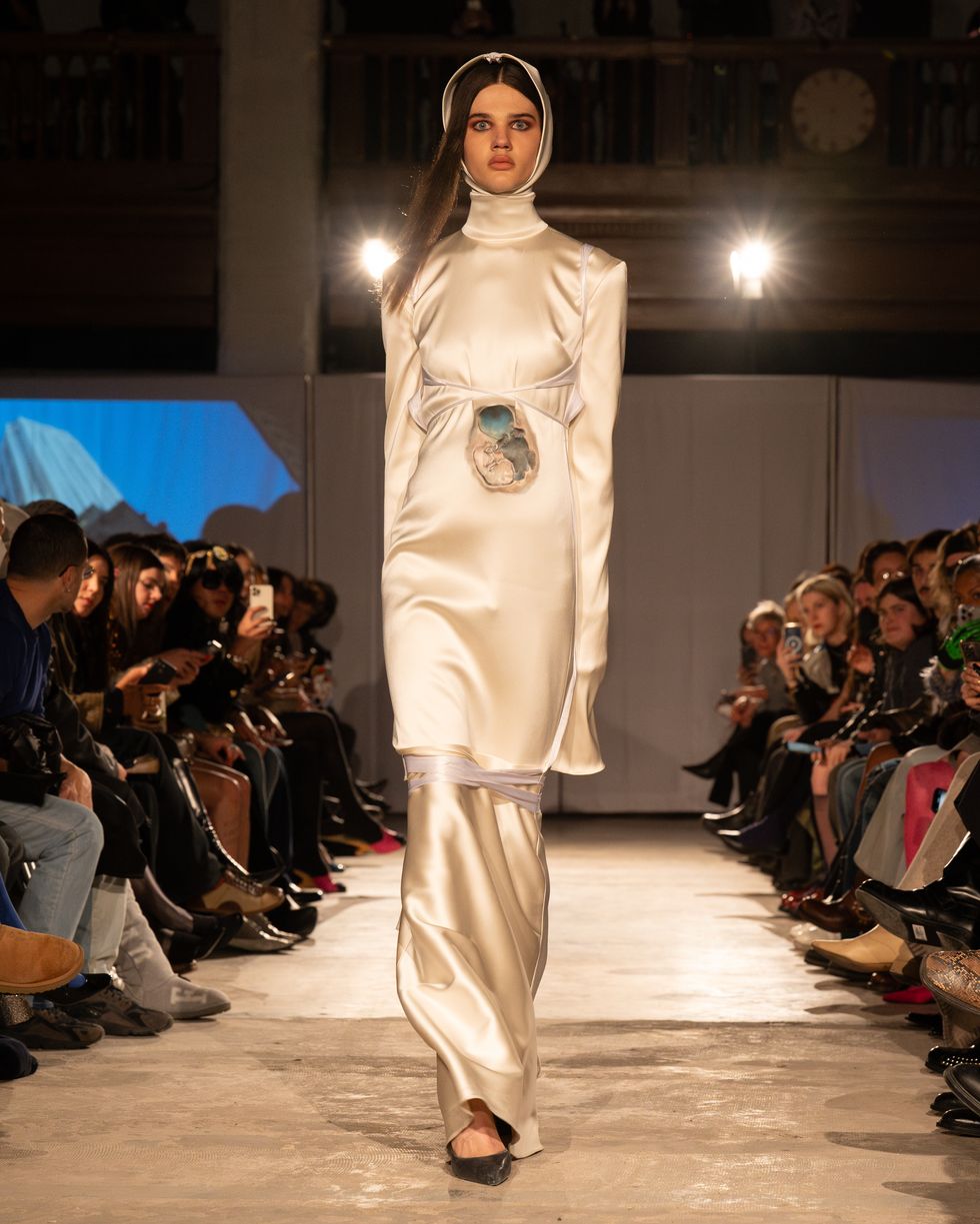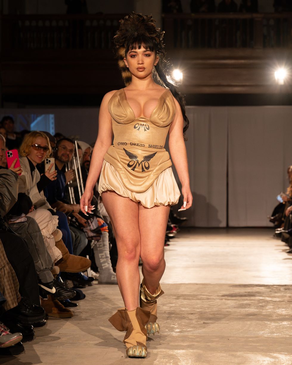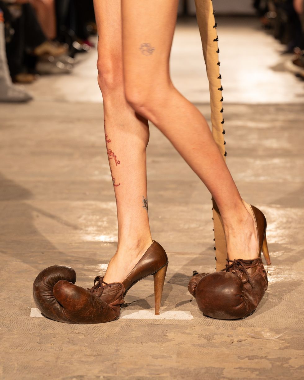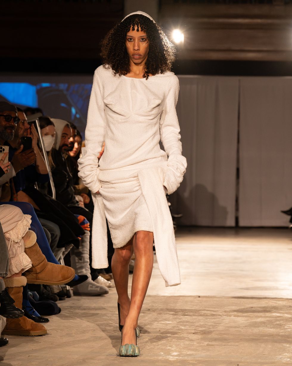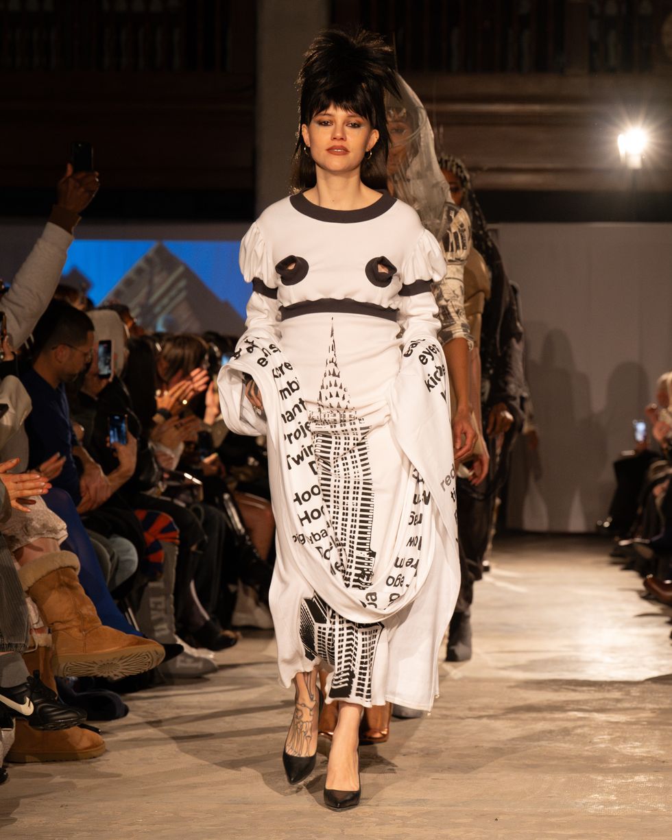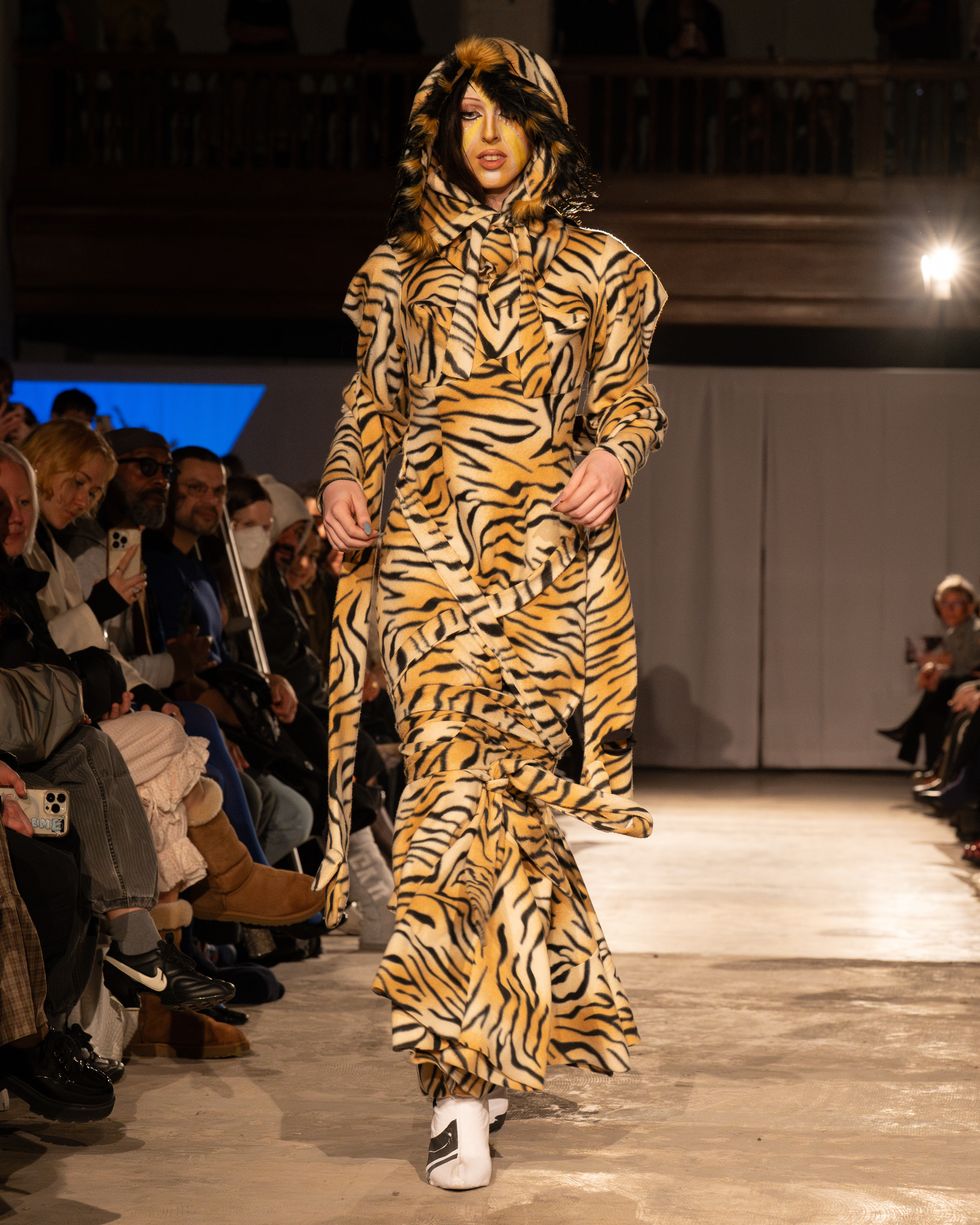 Their Fall 2024 show, entitled "Enfer" ("hell" in French), was a manifestation of this titular taste level. Held in a spotlit enclave across from the New York Stock Exchange, it featured some of the most interesting and exciting looks this season. Brand founders Mattie Barringer and Amanda McGowan made it a point to channel the animalistic instincts of being a New Yorker with models donning fur tails, Sasquatch-like stoicism and even live butterflies entrapped within white veils. Other notable touches included boxing glove boots and dresses imprinted with the Empire State Building — a commentary on the athleticism it takes to walk the streets of New York on a daily basis.