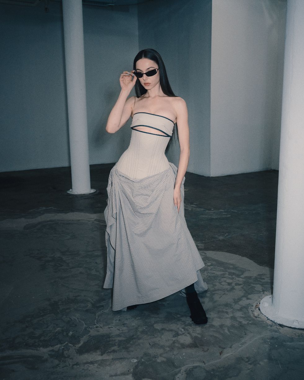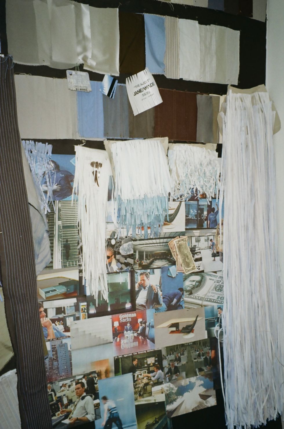 For Spring 2025, Wade was drawn to the corporate elite world of finance. By deconstructing power suits, dress shirts and denim, and turning them into corsets and petticoats, the collection became a critique of unchecked greed under capitalism: Are we willing to give up our moral standards to ourselves and our communities to make a buck? Is it fair that the one percent can use loopholes in our legal system to hoard wealth?