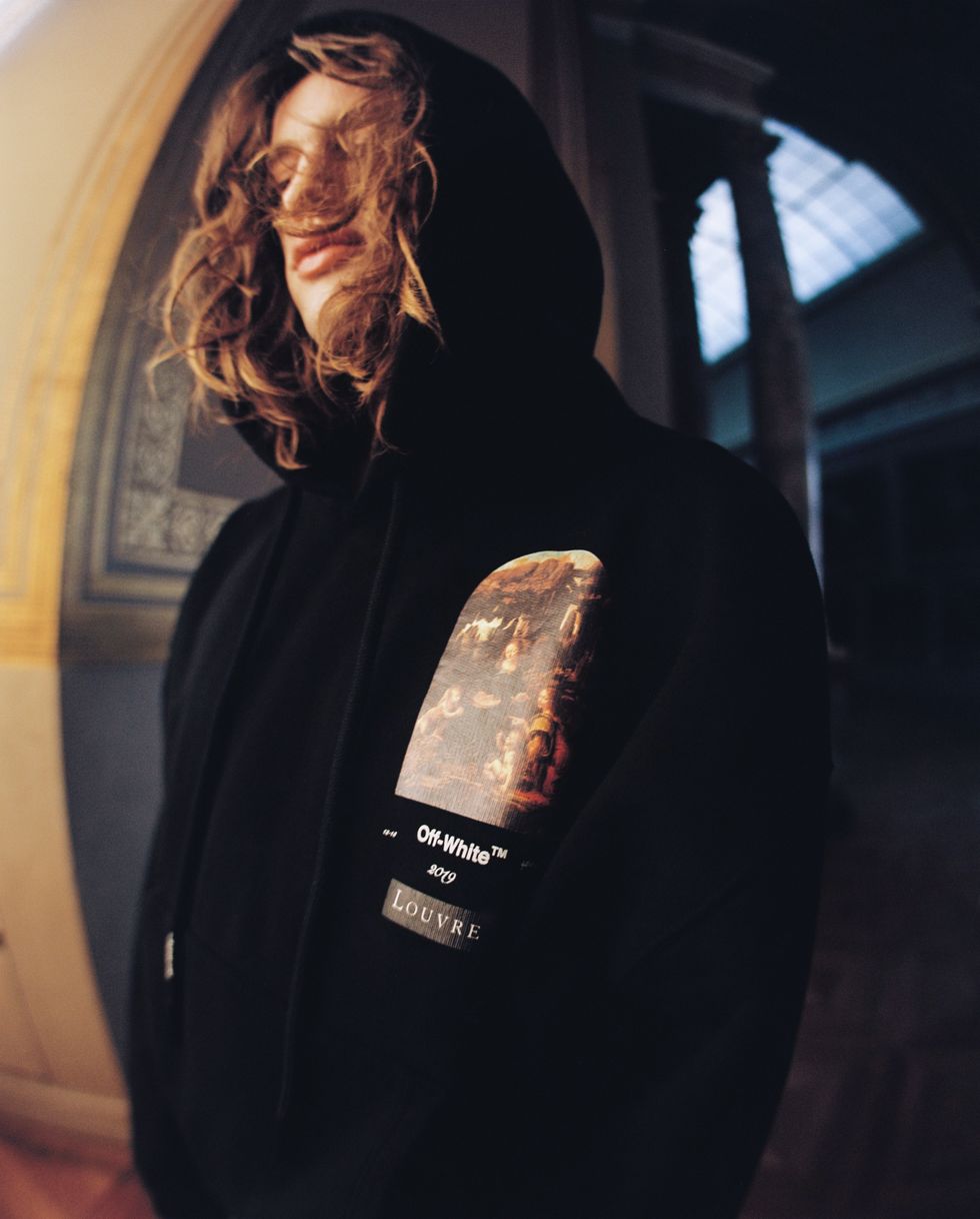 Unfortunately, no Mona Lisa imagery is featured in the collection. However, da Vinci's other famous works including Virgin of the Rocks and Saint Anne are woven with the some of his iconic drawings throughout, such as the anatomical sketches of the male form. Off-White logos and arrows are also interspersed in the collection of tees and hoodies.