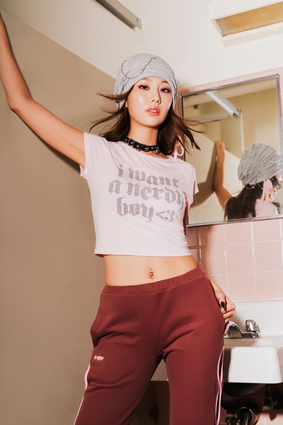 For this collab, OHTNYC creative director Jinsol Woo incorporated OHTNYC’s badass identity into streetwear items worn everyday like beanies, baseball caps and hoodies by adorning it all with studs and hooks with barbell piercings. There's one cropped tee that says, “I want a nerdy boy <3” in text code as a shoutout to the hottie geeks and nerds out there. Nerdy’s tracksuit, which is a signature item that first made the brand viral, is updated with sexy cutouts and ties as a nod to the balletcore trend. Wear it with some ballet flats to fully commit!