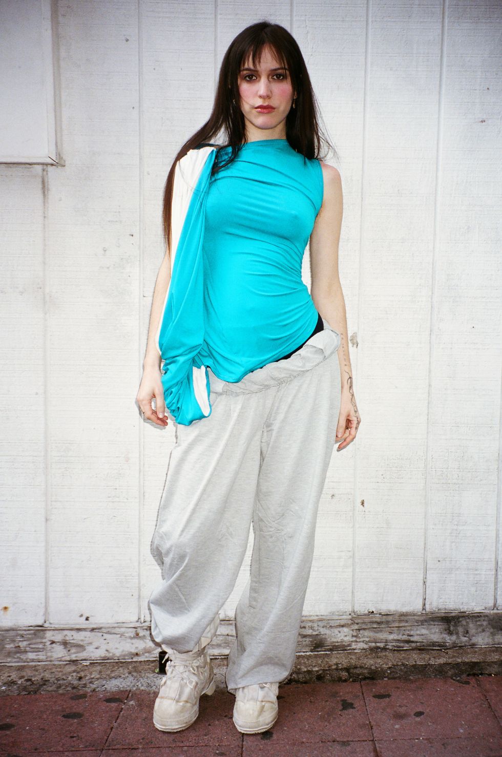When I started working on the visual creation for the album, I had already spent two years talking about the tracks and the lyrics. When building up the mood boards and references, I didn’t try to explain or connect them to the music. In the pictures, I was like, “Is it going to be just me? No, it’s going to be with people. Which actions do I want to happen?” I really wanted each picture to feel like it’s been stolen, or like there’s something or somebody behind the camera. On the cover of the album, we were in an apartment and we’d been filming for two hours. I love this picture because it feels stolen; it’s not in the pose. We didn’t want a perfect angle. I’ve never seen images of my face that felt so real to me. I really wanted to get into more lo-fi inspiration. I think color choices can characterize these different ways of capturing images. The blue and greenish vibes are sci-fi; it’s giving Minority Report and Matrix, obviously. I just loved it for its nostalgic quality.