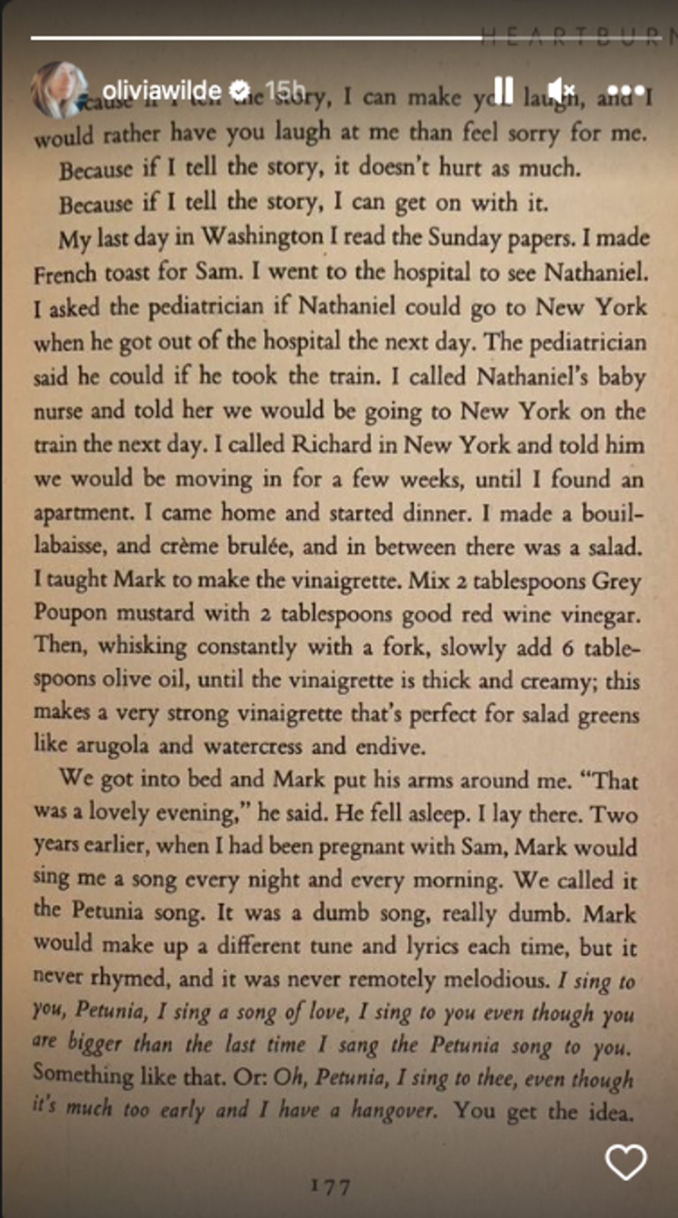 A cheeky Wilde took some time to decompress from the spiteful nanny claims and seems to have a sense of humor over the whole thing. The actress and director took to her Instagram stories to post a page from Nora Ephron's 1983 autobiographical novel Heartburn. Funny enough, the book tells of the breakdown of Ephron's marriage that only gets worse after her husband has an affair.
