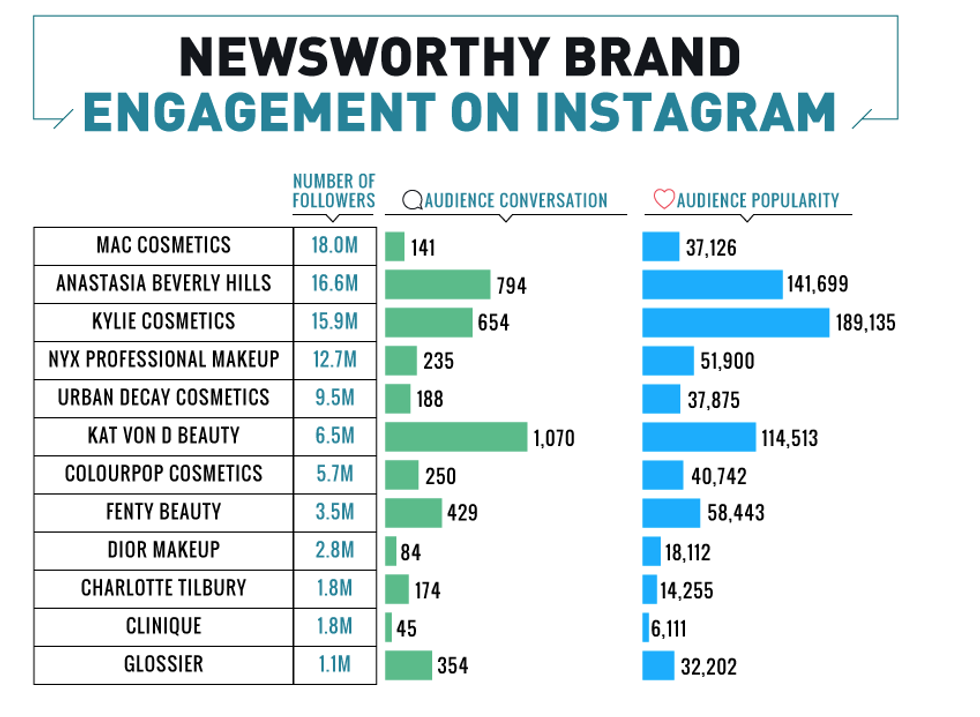 The study concludes that Kat Von D Beauty puts forth the most engaging Instagram content when it comes to celebrity-endorsed makeup, followed closely by Kylie Cosmetics (while Glossier takes out the skincare category). Established brands, despite their many locations and general prevalence in everyone's makeup bags, just can't keep up.