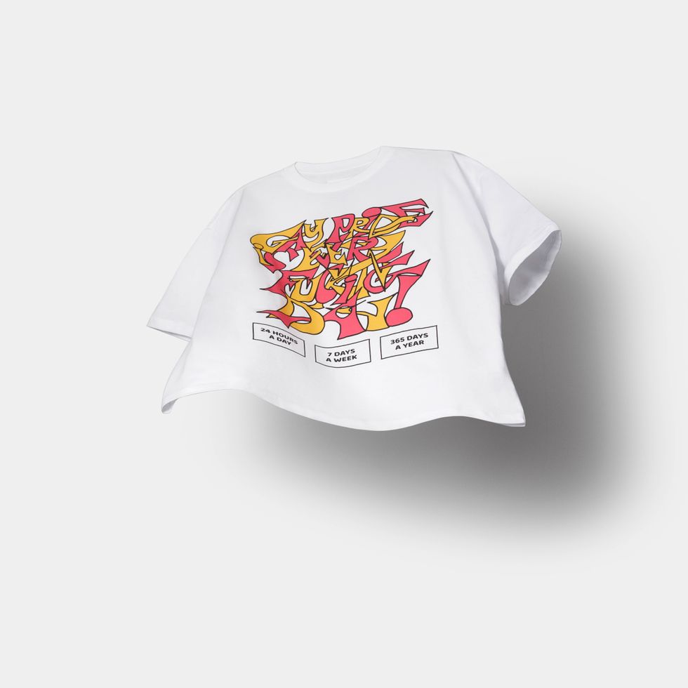 Riemer found inspiration for the line in a variety of slogans from the 1970s to the present. Each shirt is created by a different artist — Rafa Esparza, Aya Brown, Chella Man, Andrew Thomas Huang, Bráulio Amado and Terrell Davis — and features a unique graphic to celebrate Pride year-round. Brown's shirt features a jockstrap harness graphic emblazoned with "Black Lesbians," while Amado's shows a colorful take on the "Gay Pride is Every Fucking Day..." slogan from an '80s Alex in Wonderland flyer.