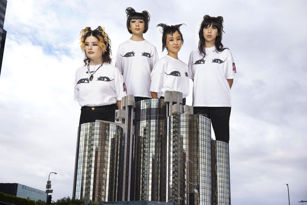 For the campaign, the four bandmates — Bela, Eloise, Lucia and Mila — are seen as giant punk Barbarellas taking over Los Angeles. It was shot by Leon, who also directed the music video for their single "Growing Up."