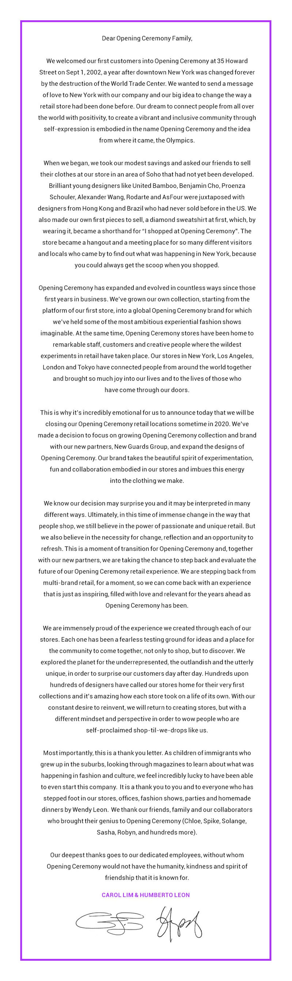 "We've made a decision to focus on growing Opening Ceremony collection and brand with our new partners, New Guards Group, and expand the designs of Opening Ceremony," the founders wrote in a joint statement. "We are stepping back from multi-brand retail, for a moment, so we can come back with an experience that is just as inspiring, filled with love and relevant for the years ahead as Opening Ceremony has been.