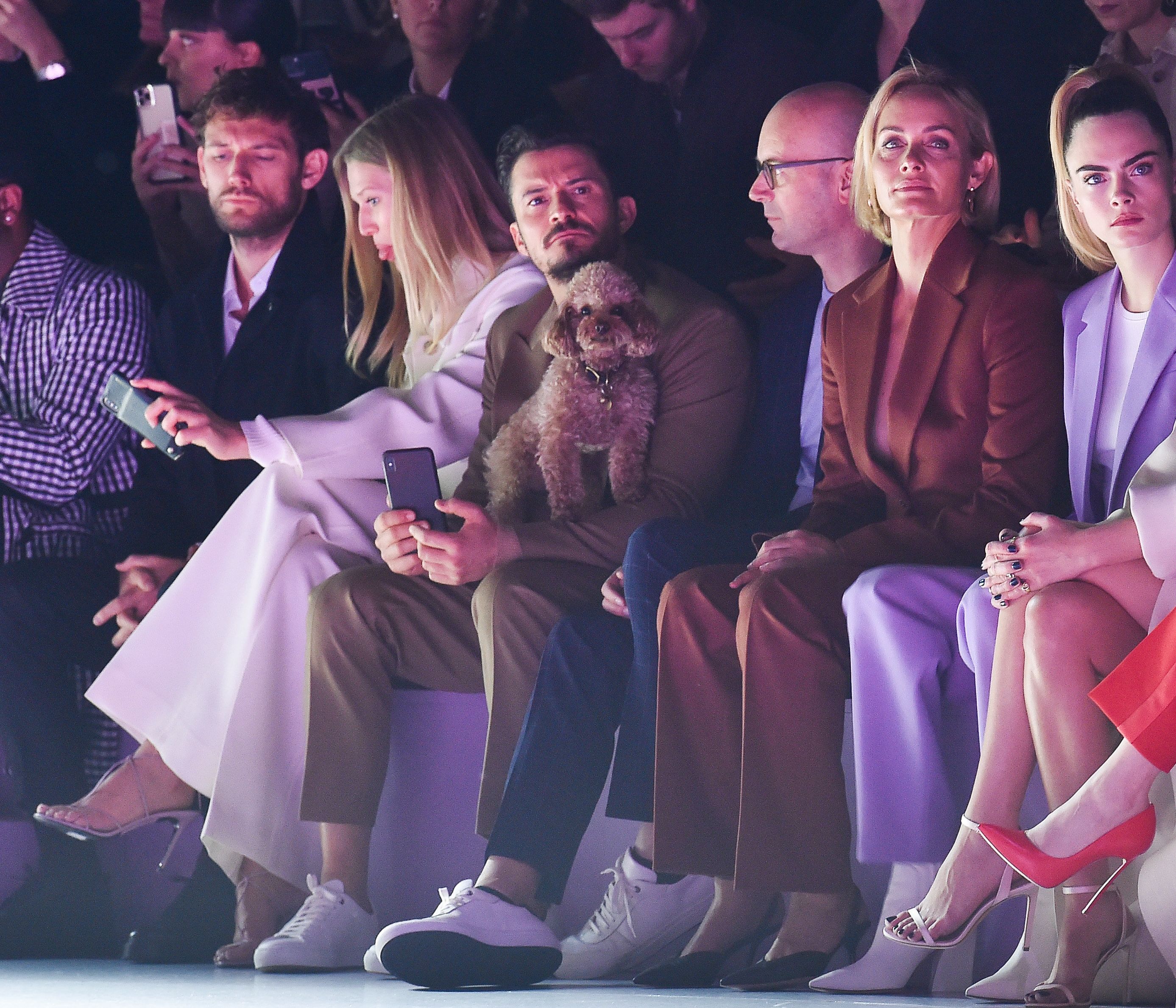 Nearby celebs like Cara Delevingne, Amber Valleta and Ashley Benson couldn't keep their paws (ahem) off Mighty as they took turns cradling the adorable pup. Bloom, who was wearing a double-breasted suit by Boss, matched his camel-colored friend effortlessly.