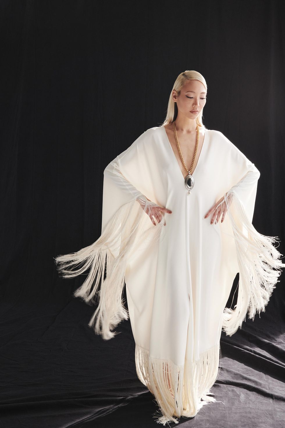 Those buoyant qualities manifested itself in sweeping fringes, rainbow knits, crochet tops, colorful kaftans and beach-y hats by Gigi Burris. Garcia says they believe the world will be in a different place, hence the inclusion of some occasion dressing like a silk moire evening gown with dramatic bows and a sculptural, ruffled cocktail dress.