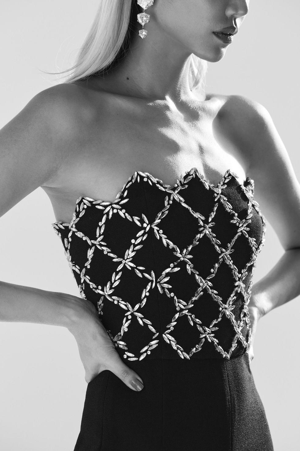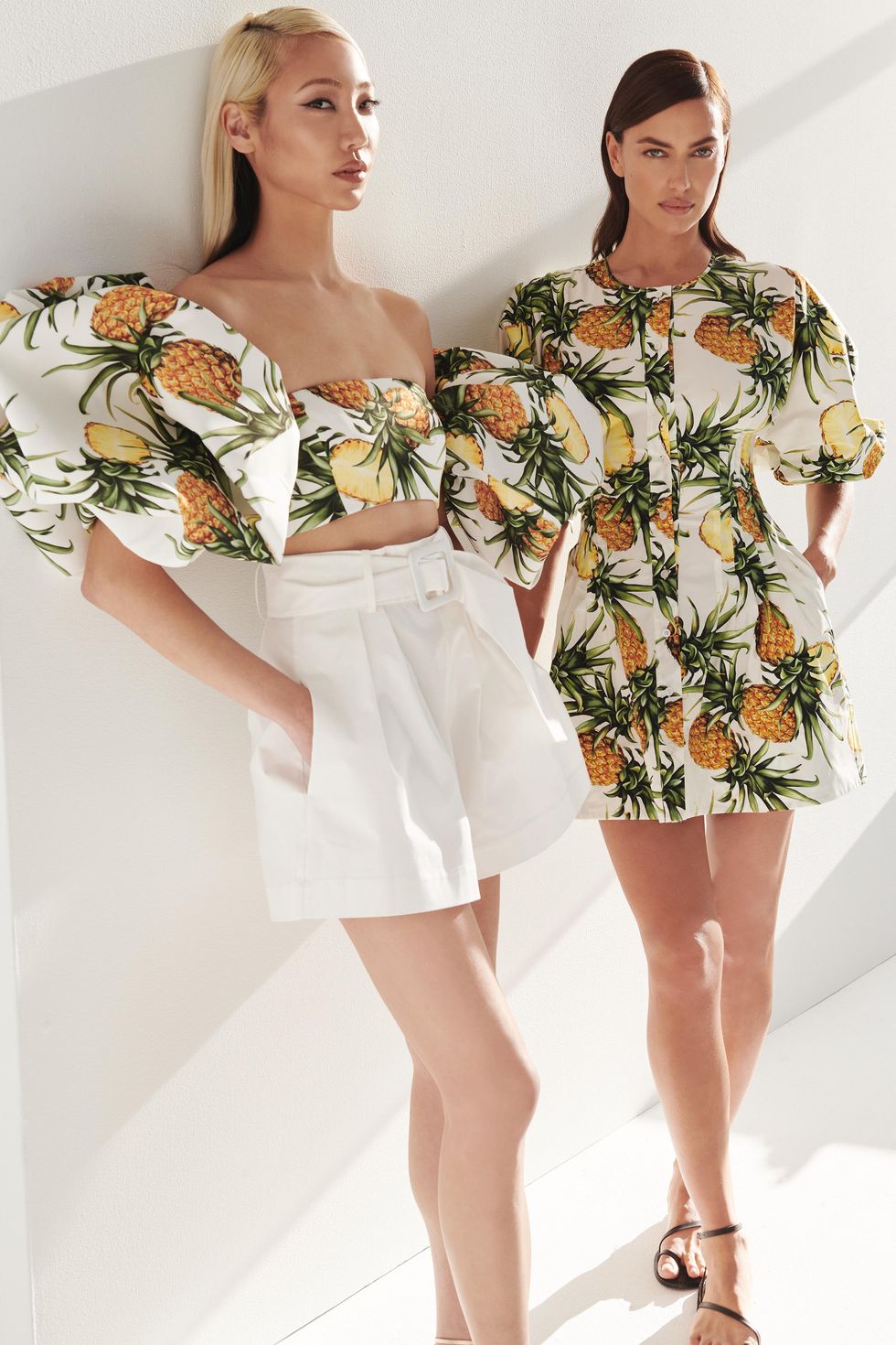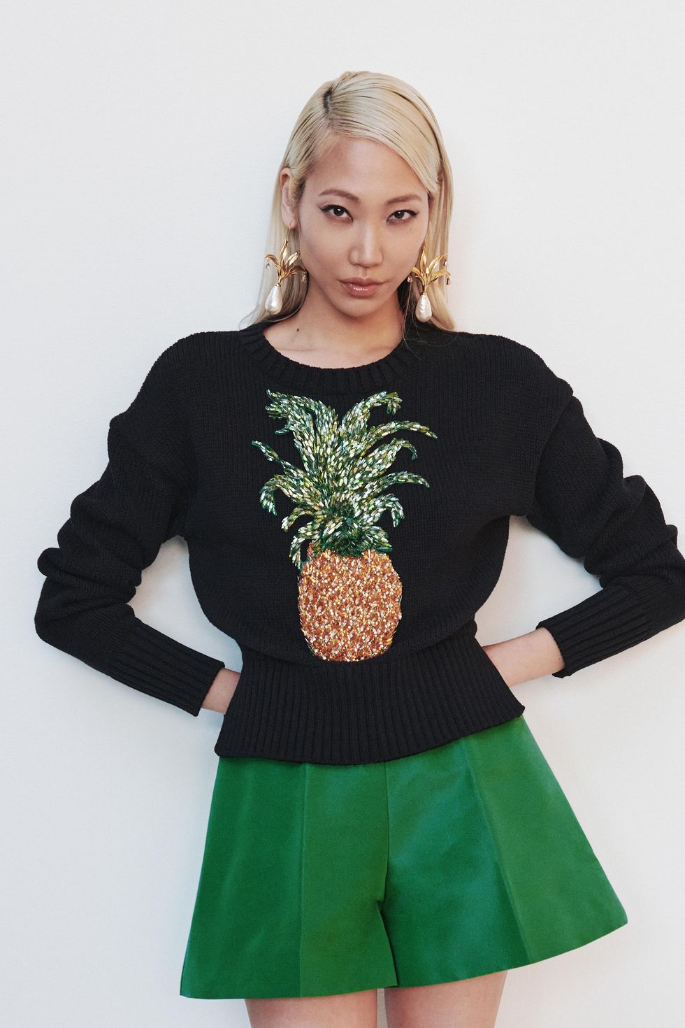 The pineapple motifs are a nod to a look from Oscar de la Renta's tropical Spring 1992 collection, which saw Linda Evangelista sport a white suit jacket with two giant embroidered pineapple prints with matching earrings, skirt and turban. "We were thinking about when Oscar showed us that collection and how he was making fun of himself at the time," Garcia says. "We found them to be quite whimsical and brave for him to put two insanely embroidered pineapples on the bottom of the jacket."