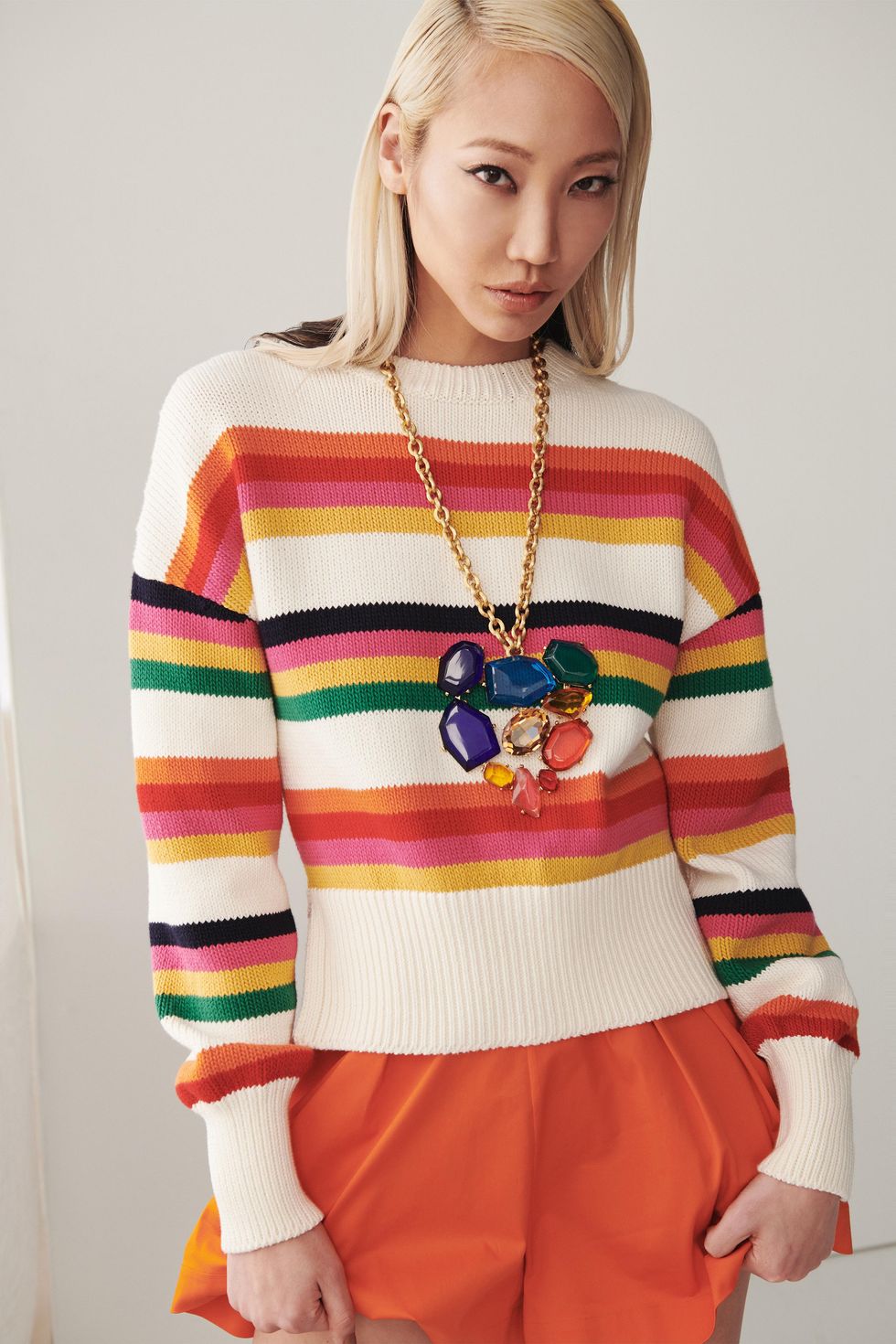 The duo continues to balance Oscar de la Renta's uptown sensibility with their youthful and edgier touches as seen in aggressively knotted belts, novelty brooches developed by Gemcraft used as buttons and a jagged rainbow heart pendant. Among their more experimental offerings were a series of looks with rick-rack trims on the side of pants, along the edge of knit dresses and as a graphic grid print.