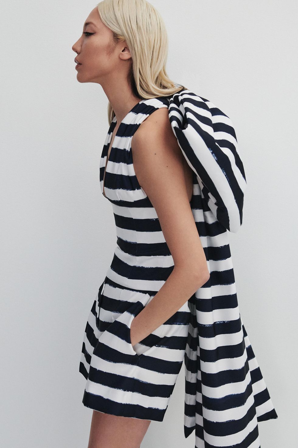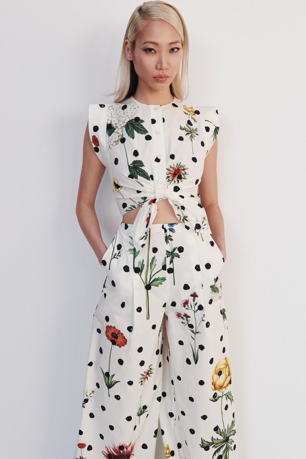 Other archival references include some vintage wildflower prints overlaid with painted treatments of stripes and polka dots in silk faille dresses, trousers and trench coats. "We took old archival prints, which are not allowed to be reprinted," he says. "Any other brand can tell you this process is very meticulous when they have something that is an archive print, even if it's your own brand, they need you to develop something on top of it to differentiate it for legal reasons."