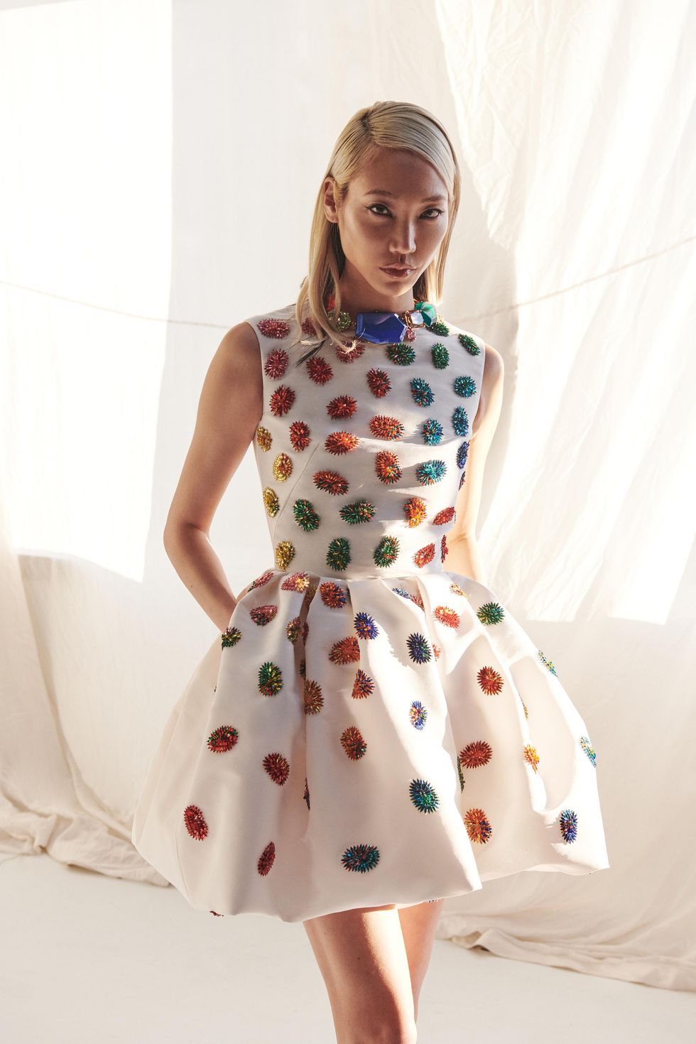 For the finale look, Garcia and Kim developed an embroidery that mimicked the rainbow colors of the collection as polka dots on a fun little party dress for Soo Joo. "Everything that we do for the brand and everything that Oscar always gravitated towards was very bold, graphic and vivid," he says. "We're feeling very optimistic for next summer, as you can see!"