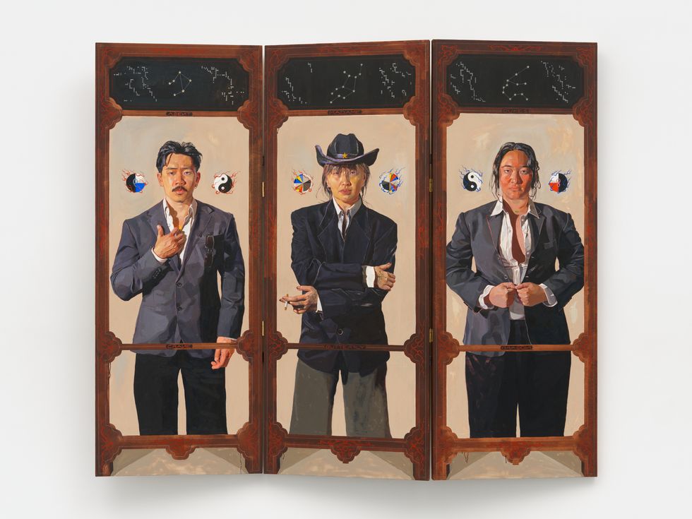 The recurrence of gender and sexual stigmas in the American political landscape of late make yi Hou’s puckish barbs all the more subversive. At James Fuentes Gallery in New York City, he hung his show The beat of life with the BTM-heavy painting “Coolieisms” centrally visible from the street, “inviting in the riff raff,” announcing its directness and receptivity. The exhibition’s soft power repudiates recent amplifications of conservative desires, fears and anxieties transposed onto queer people, particularly queer and trans people of color — a displacement rooted in fear and fantasy gender theorist Judith Butler calls the “phantasm of gender.”The triptych “Birds of a Feather” is agentic in two ways, displaying the artist and two dear friends as secret agents, and these figures jovially and self-determinantly engaging with stereotypes. Yi Hou is designated “Agent Crane,” reflecting the recurring motif in his oeuvre based on his Chinese name meaning “one bird song.” The middle panel shows Amanda named as “Madame Butterfly,” alluding to Puccini’s opera and perpetuating the notion of subservient Asian women willing to do anything to serve the dominant force, in this case the Western man. Sasha on the right-hand panel is referred to with the moniker “Dukes Dragon” refers to daisy dukes and is a play on words, twisting the sapphic “dyke” into “duke.” Together, these multidimensional renderings embody several dualities — masculine/feminine, homosexual/sapphic and signifier/signified — thickly contouring the human experience and leaving the stereotypes inanimate and effigial.