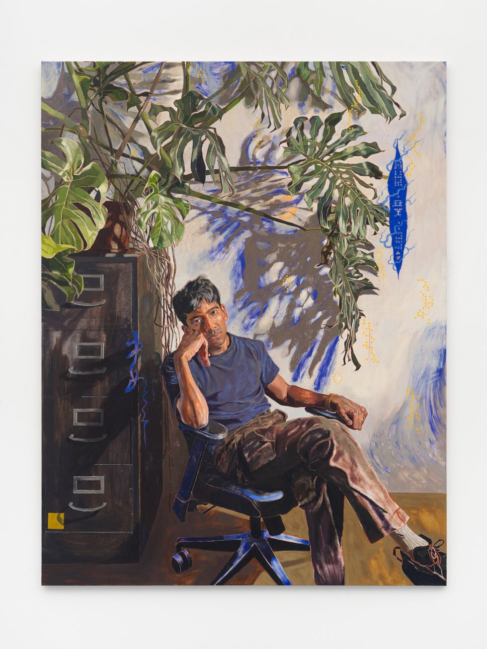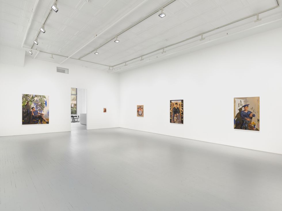 Between his first James Fuentes show, headlining at the Brooklyn Museum and his current display, the juxtaposition of his portraiture puts its development into sharp relief. “Self-portrait (21)” thrusts upon the viewer yi Hou’s youthful panache, emulating Van Gogh's bold, directional brushwork and brightly saturated oil-based palette. Its colorway conveys an ebullient femininity suggesting the transient nature of masculine and feminine energy, perhaps especially in youth. Conversely, “Self-portrait (25)” uses gouache and oils, producing darker, richer colors and material qualities. The shift in ethos over time may appear purely external but perhaps shows maturation that is natural with age.