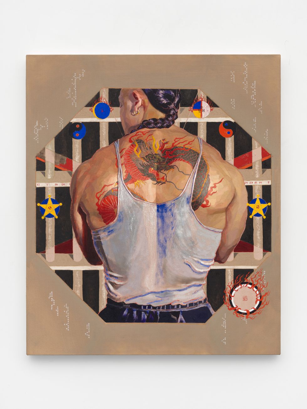 Visual authority continues to be represented in his sophomore James Fuentes show by way of masculine figures. “The function of masculine figures differs now, as opposed to my more confrontational Brooklyn Museum piece, ‘Coolieisms, aka: Leather Daddy's Highbinder Odalisque,’” he says. He continues, “The ass painting is facing away and is more receptive — you’re put on display, the way masculinity in the butt and dragon tattoo paintings are rendered; there is a bit of scrutiny.”