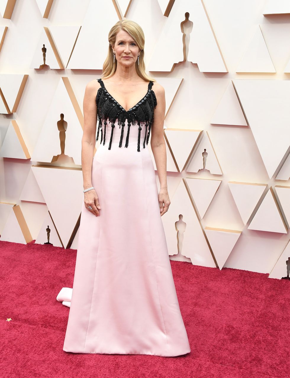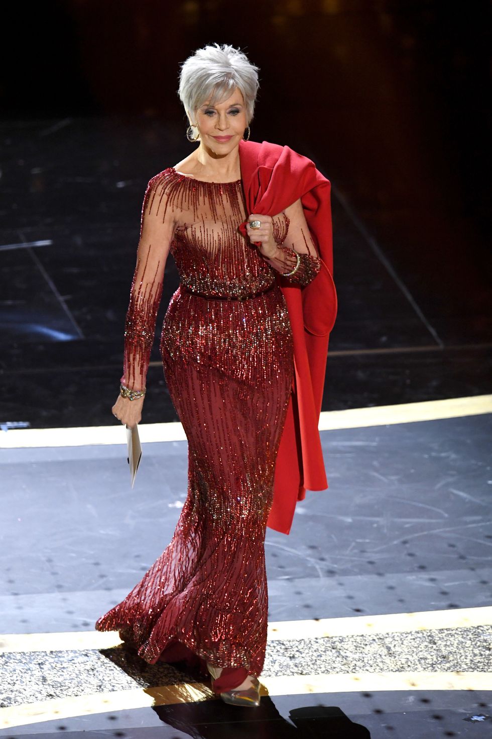 We're not going to waste time on Renée Zellweger in Armani Privé, Margot Robbie in Chanel, Charlize Theron in Dior, Florence Pugh in Louis Vuitton, Saoirse Ronan in Gucci, or even our beloved gay icon Laura Dern in Armani Privé. We've seen it all before. Let's focus instead on some women of a certain age. Most notably actress-activist Jane Fonda, 82, in a beaded red Elie Saab Couture dress first debuted at the 2014 Cannes Film Festival. She paired the look with her now-signature red coat (which in November she declared was the last article of clothing she'd ever buy) and Pomellato jewelry, "because it only uses responsible, ethically harvested gold and sustainable diamonds," she wrote on Twitter.