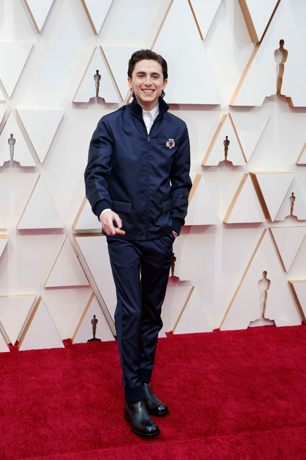 So how did last night fare? Let's start with getting the king-shaped elephant in the room out of the way: Timmy. Perhaps, in retrospect, we are to blame. Us (or am I projecting, and it's mostly just me?), who gassed this young man up in a way that his only next option was to fall. A "chic mechanic," a "sexy paramedic," a valet attendant, a gas station manager — these were just some of the ways Timothée Chalamet's navy blue Prada jacket and trousers paired with a Cartier Vintage 1955 ruby & diamond brooch were described online. (He's rumored to have picked up the outfit from a Prada store in Los Angeles earlier in the day.)
