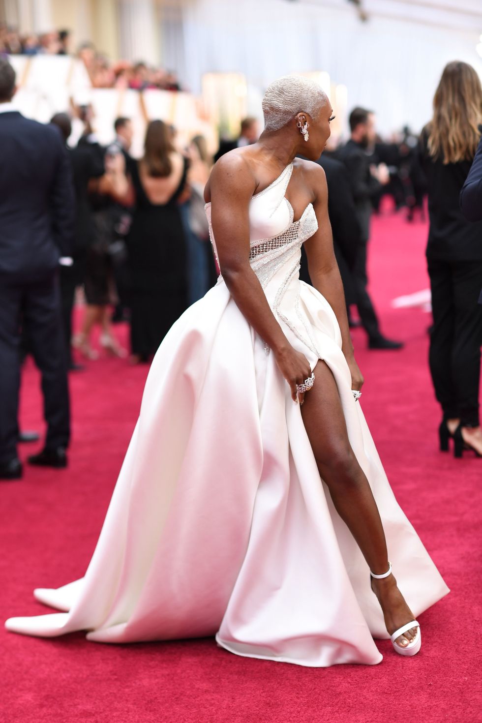 Other best dressed contenders included a 1-2 punch from Atelier Versace, first with nominee Cynthia Erivo in a sculpted white gown featuring a graphic cut, asymmetric bustier entirely pleated by hand and a skirt hand-embroidered with Swarovski crystals. "It was as if that dress had to summon up enough glamour for all of the black actors, Asian actors and others who were overlooked," wrote Washington Post Fashion Critic Robin Givhan. "Erivo was standing in the limelight for herself, but surely there were those who took in her presence and saw themselves in her." And then there was Regina King in a commanding custom peach-toned silk Atelier Versace dress featuring an asymmetric bodice that was fit perfection.