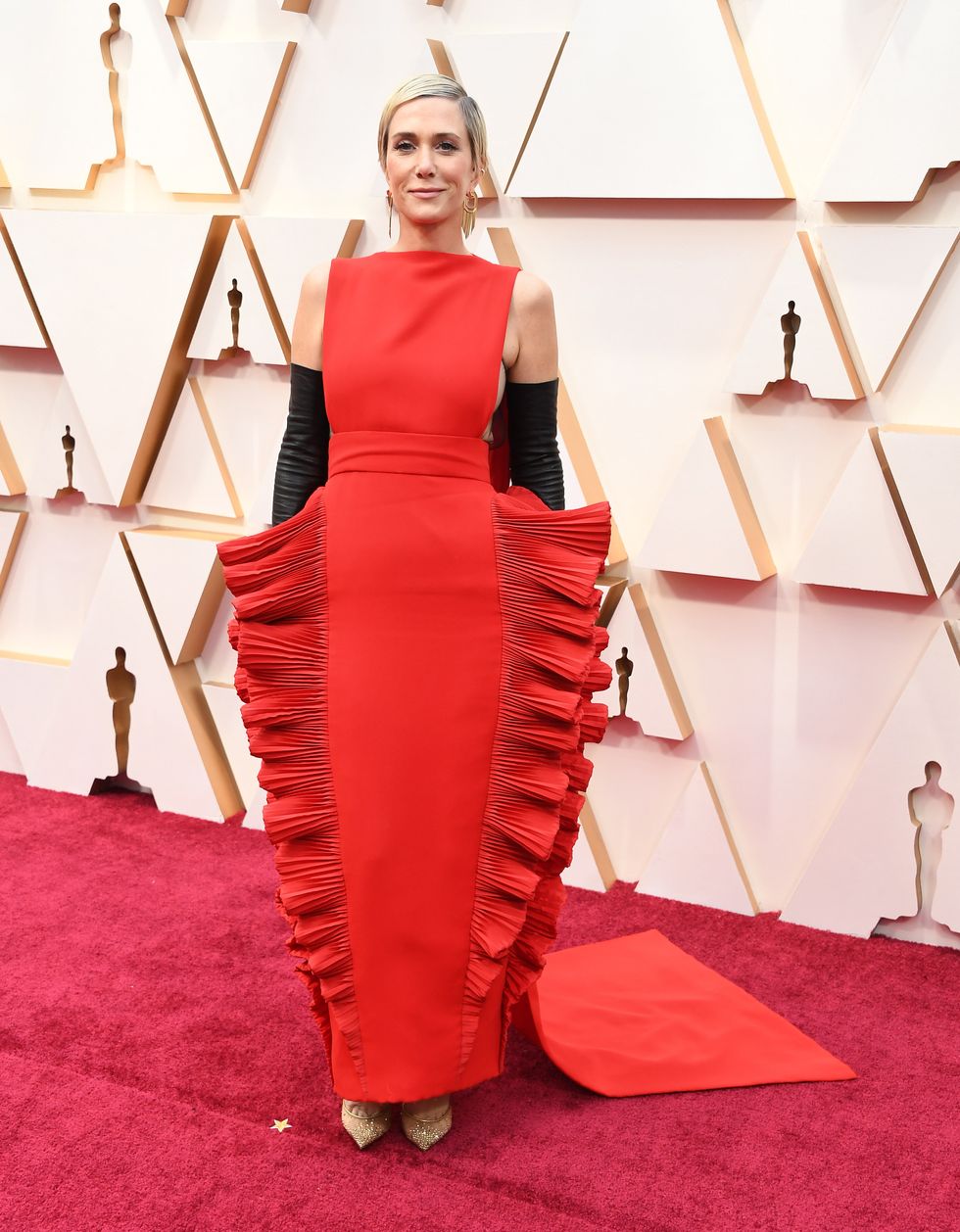 Opting out of a safe silhouette, and with my fave look of the night, was Kristin Wiig — who, as writer Kara Brown noted on Twitter, has found her best hair. You're gonna read some ~takes~ that will latch onto tweets calling the look "a hot piece of lasagna" or comparing her to Sebastian from The Little Mermaid, and they're not wrong. But that's fashion, honey. Wiig wore Look 56 from Maison Valentino's Spring Haute Couture collection. It's a crêpe armure coat and dress with taffetas volants and Valentino red tulle and long black gloves that took 650 hours of handwork, according to the storied house's PR. In this house, we stan a risk.