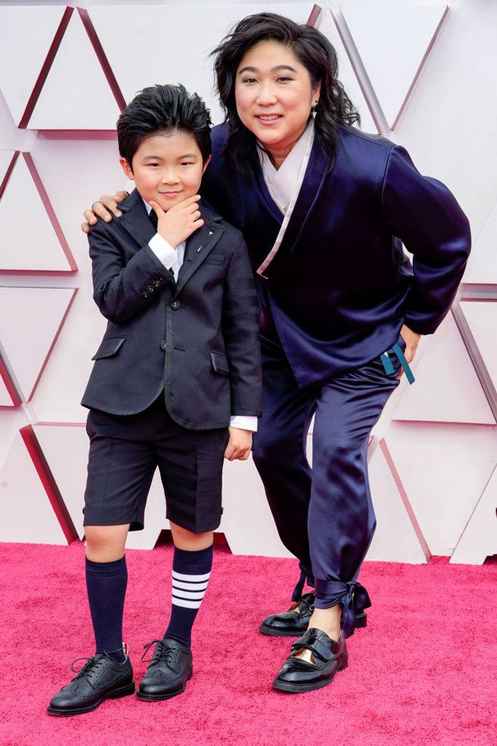 And then there was Daniel Kaluuya, who picked up his very first Oscar, a Best Supporting Actor win for Judas and the Black Messiah. "Dressed in all black like the omen," wrote stylist Shiona Turini, who outfitted Kaluuya in Bottega Veneta and Cartier jewels. Rounding up the men's best looks was pint-sized style icon in the making Alan Kim, who wore custom Thom Browne for his first time out at one of the biggest nights in film and fashion. His look was comprised of the brand's classic shorts tuxedo in school uniform weave with black engineered 4-bar, white poplin shirt, bow tie and their signature 4-bar socks and a black pebble grain calfskin longwing brogue.