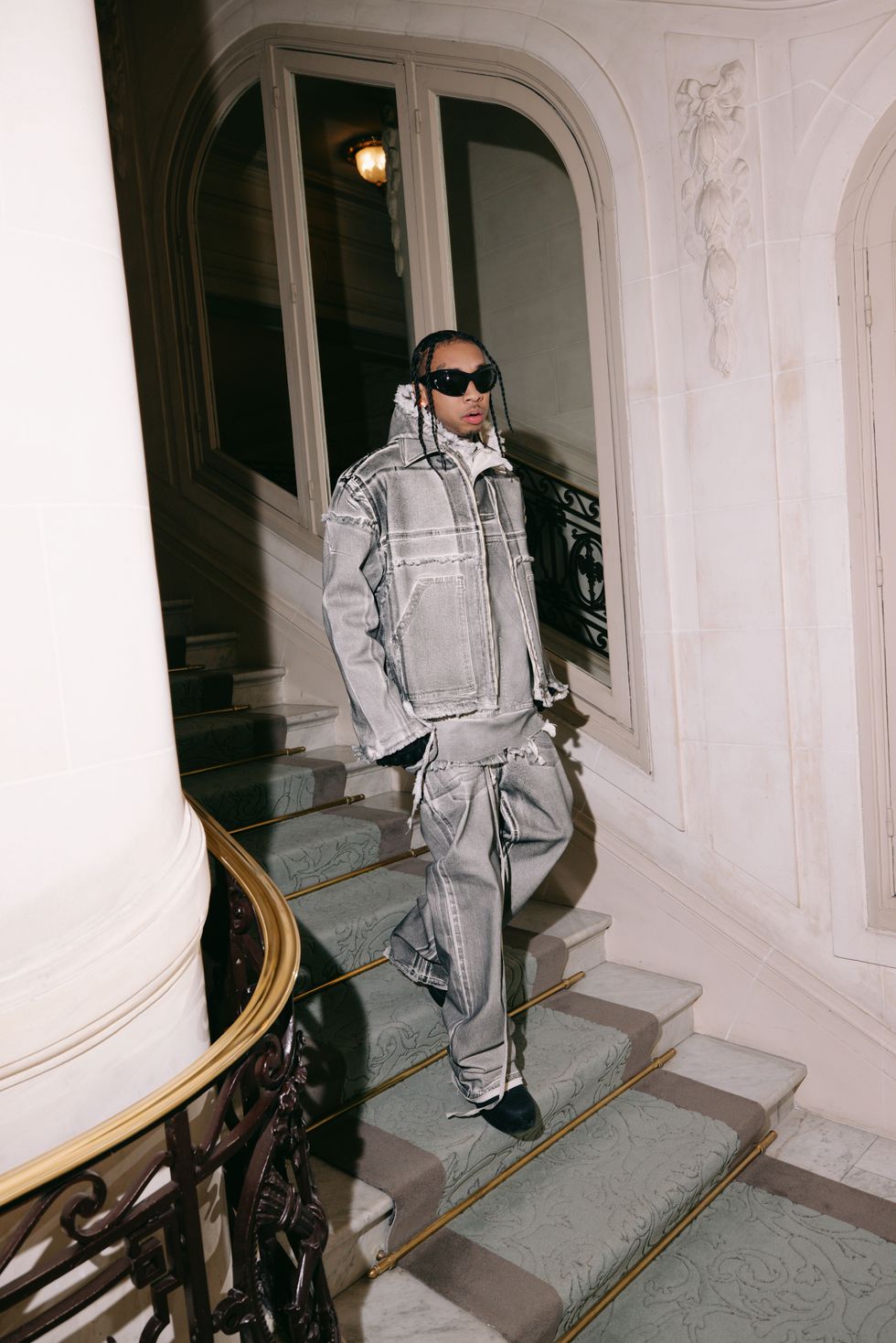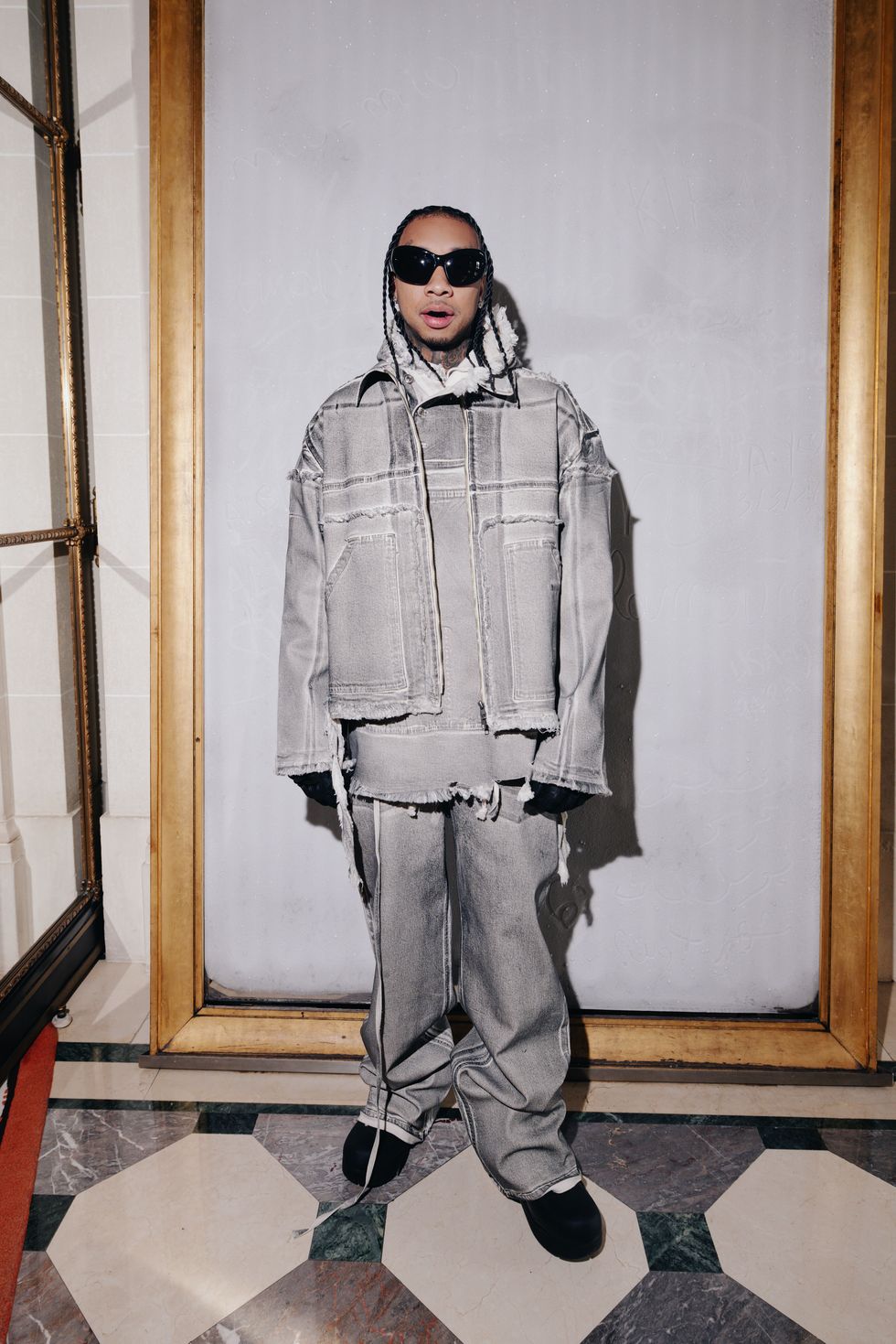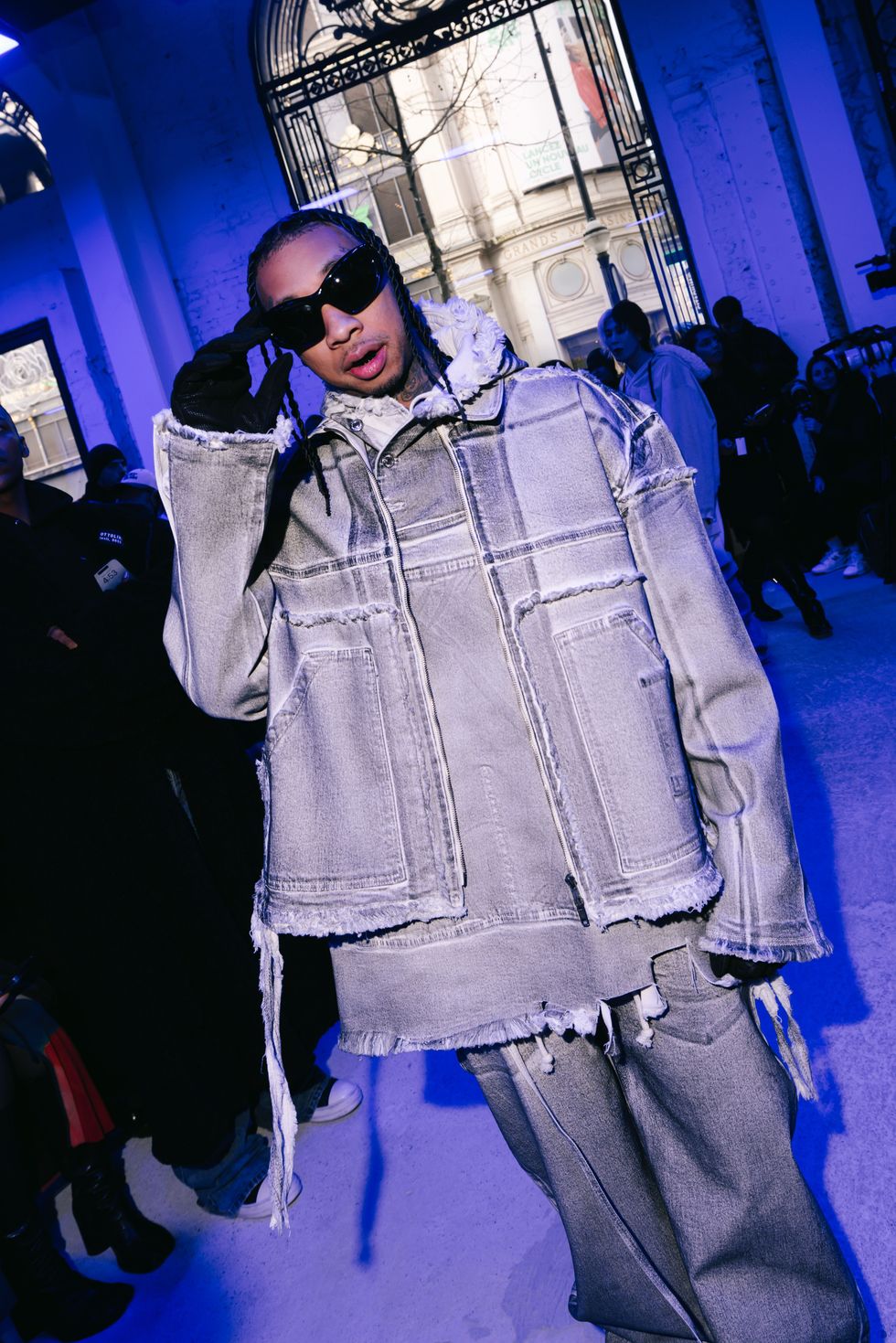 The Berlin-based brand, led by Swiss designers Christa Bösch and Cosima Gadient, is known for leaning more avant grade and experimental. This season, tailoring and knits and mesh were deconstructed into unconventional forms. As he watched from the front row, Tyga repped the brand in a head-to-toe gray distressed denim look with raw-edged seams.