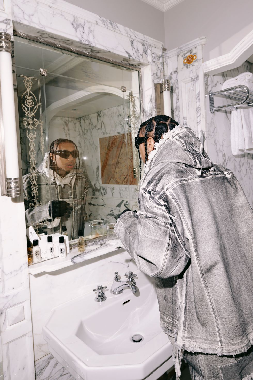 Getting ready at my hotel. Picked out the freshest fit for the Ottolinger show. I went with a full grey look with some cool, yet simple accessories. Head-to-toe in Ottolinger.