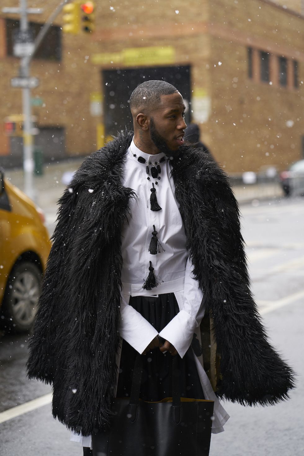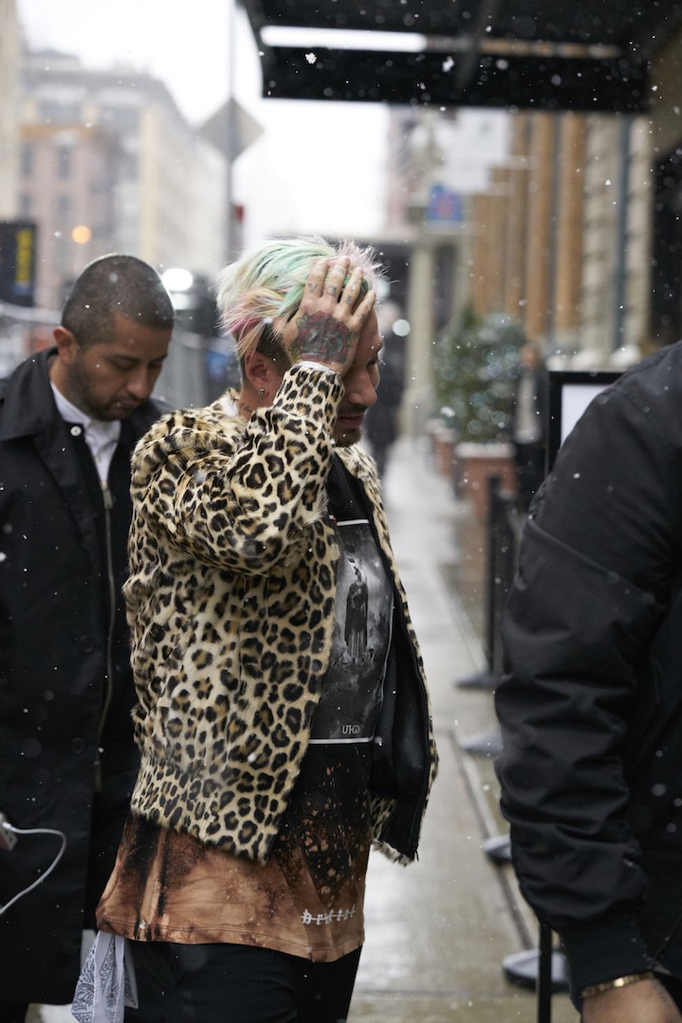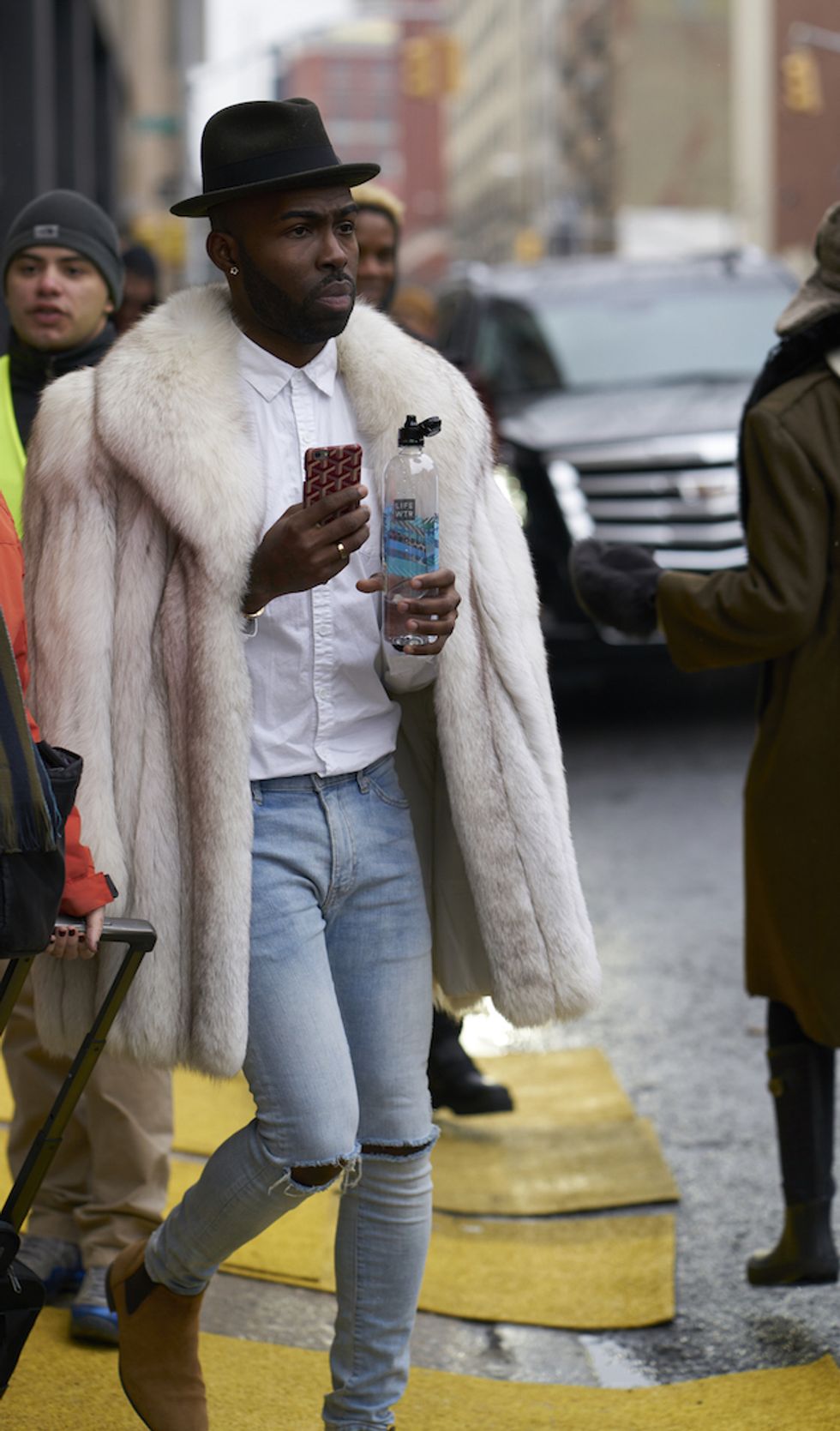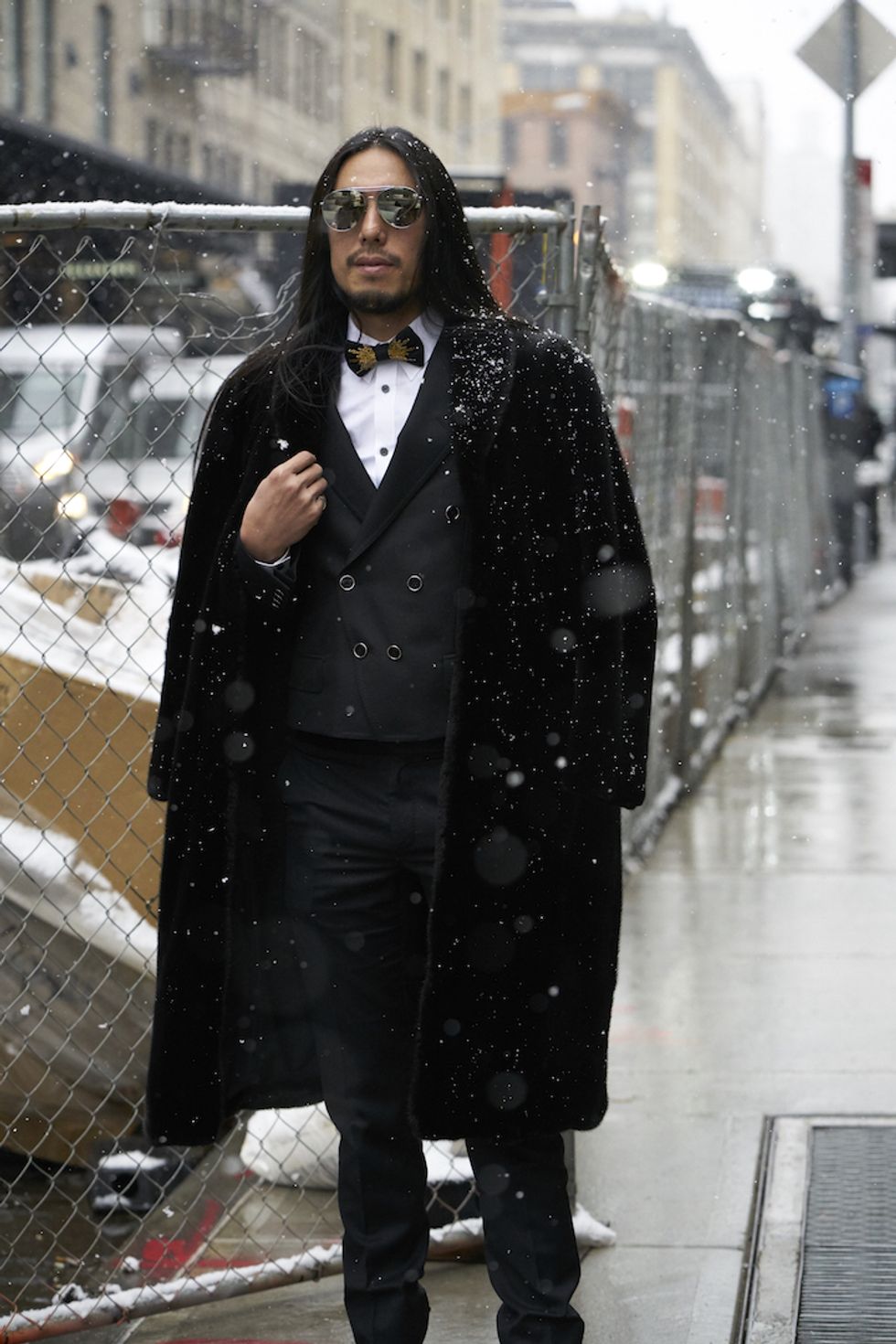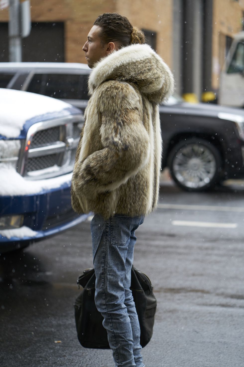 Men's Fashion Week came and went! It's a very special time of year in New York, when the genetically-blessed males of the species hit the streets en masse to flaunt their cheekbones, scowl handsomely, and test out whether or not their most outlandish hairstyles and accessories are "a thing." We braved the cold and snow to document these magnificent creatures in the wild, and divine the trends that the menswear vanguard will be rocking in 2017. We're seeing lots of faux fur, lots of real fur, western hats, head-to-toe monochrome looks, John Hughes movie realness, and in one instance, fishnet stockings.