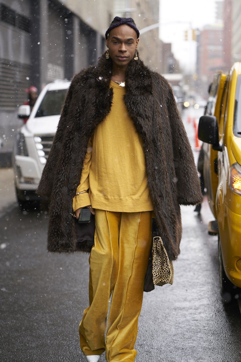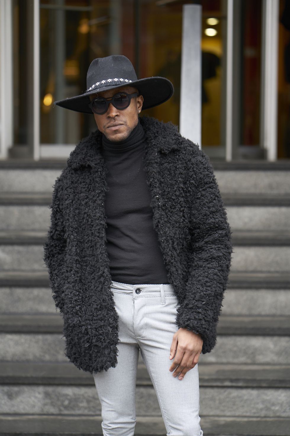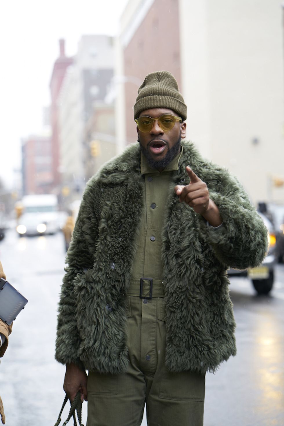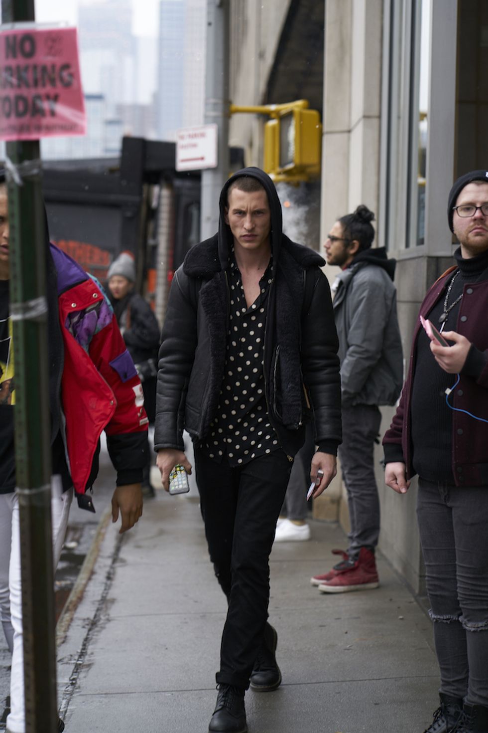 Men's Fashion Week came and went! It's a very special time of year in New York, when the genetically-blessed males of the species hit the streets en masse to flaunt their cheekbones, scowl handsomely, and test out whether or not their most outlandish hairstyles and accessories are "a thing." We braved the cold and snow to document these magnificent creatures in the wild, and divine the trends that the menswear vanguard will be rocking in 2017. We're seeing lots of faux fur, lots of real fur, western hats, head-to-toe monochrome looks, John Hughes movie realness, and in one instance, fishnet stockings.