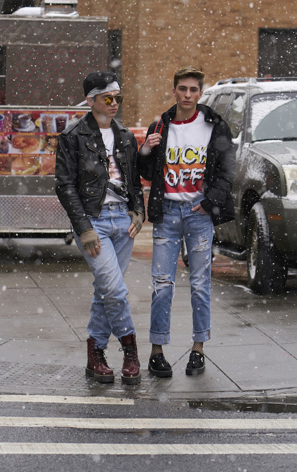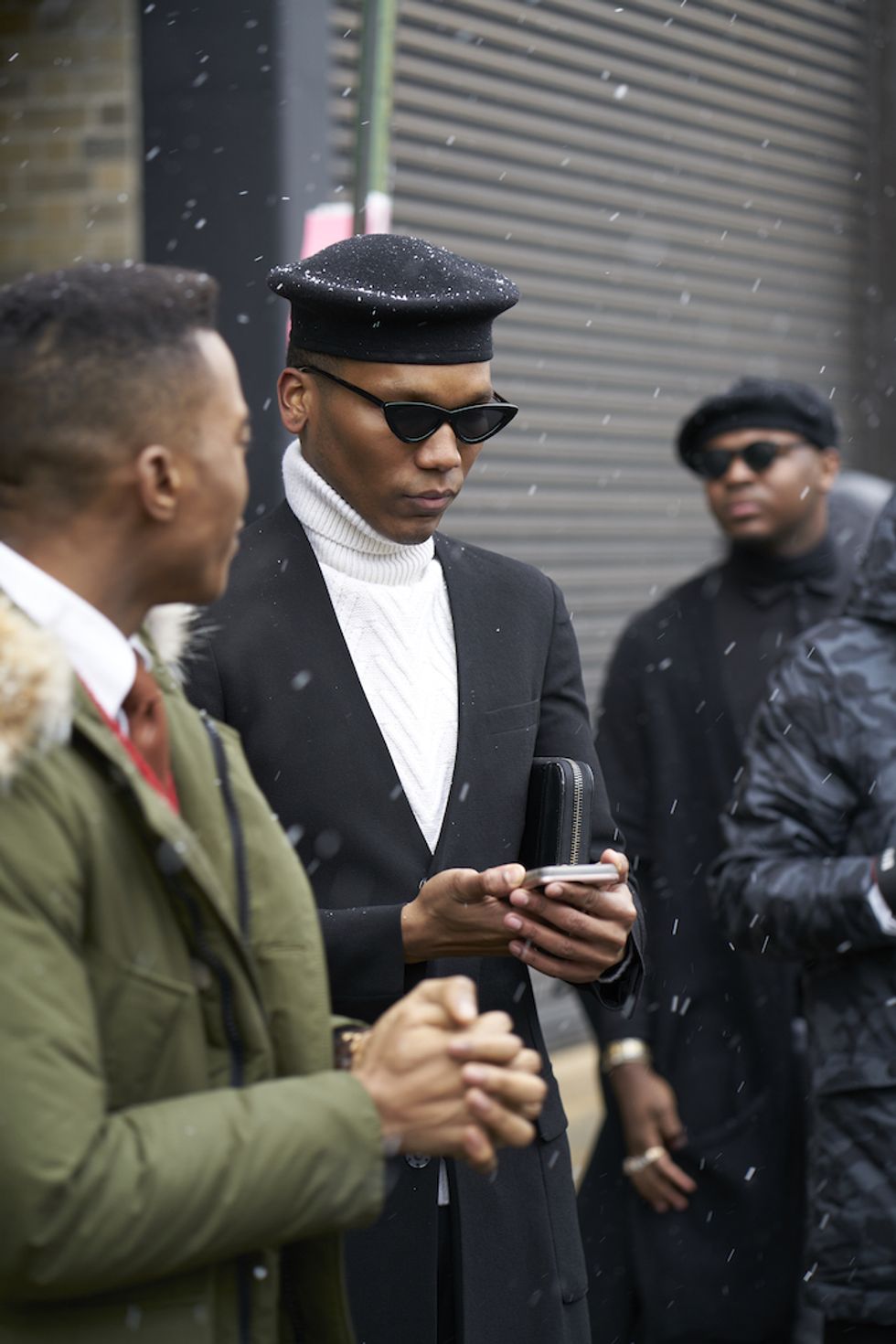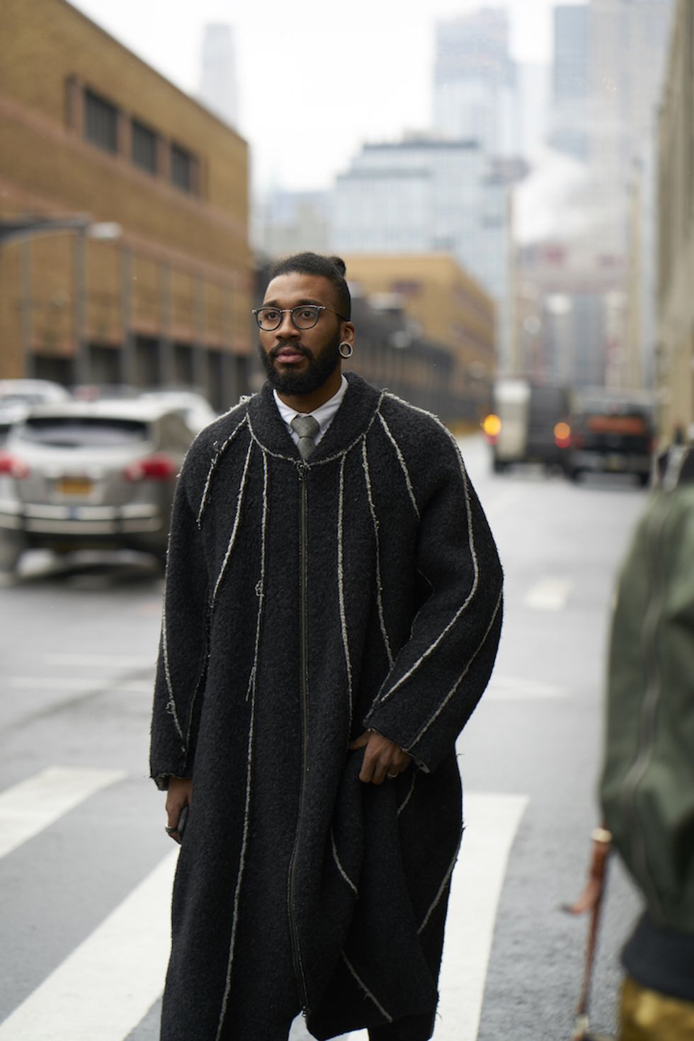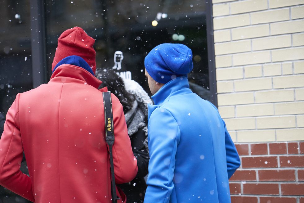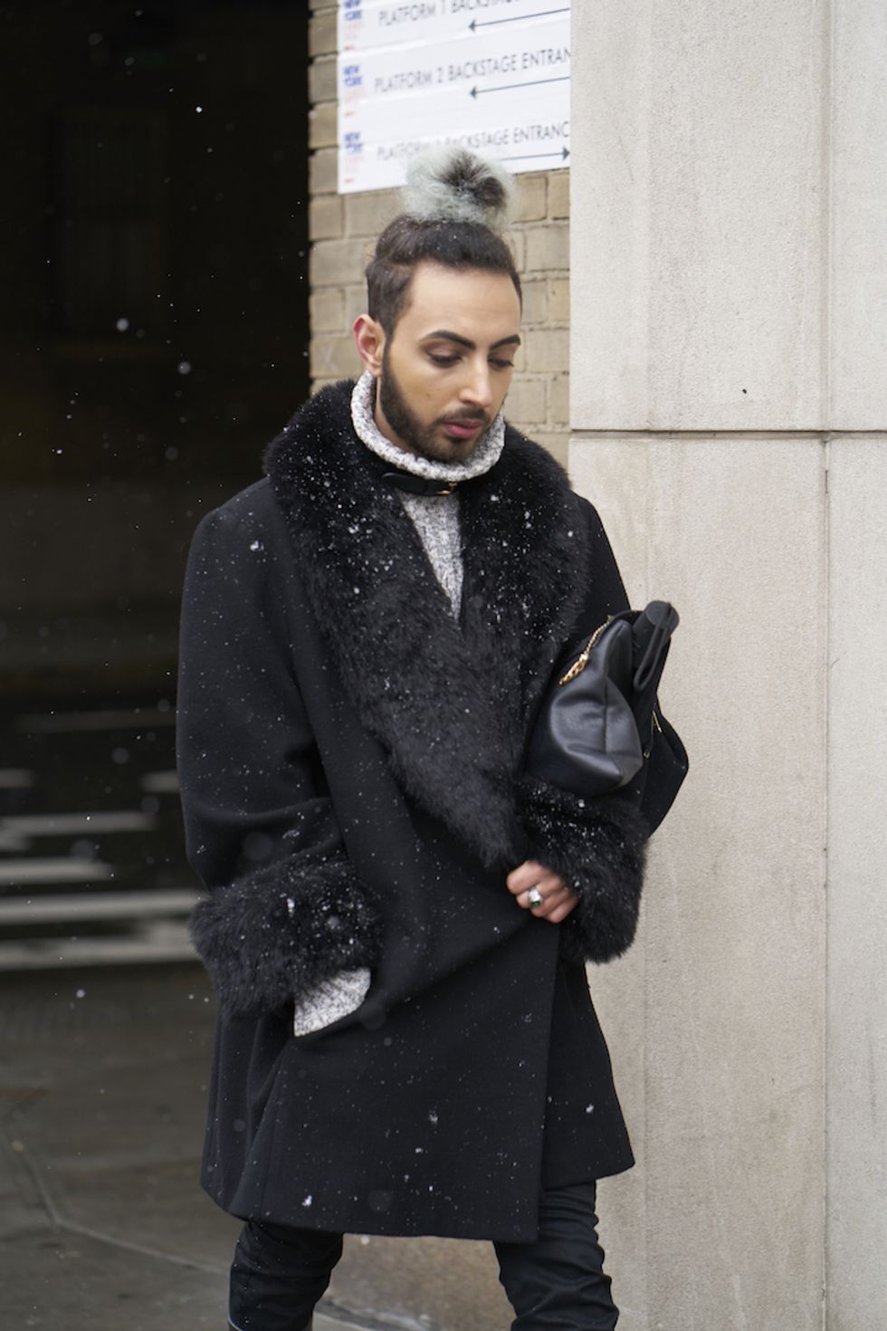Men's Fashion Week came and went! It's a very special time of year in New York, when the genetically-blessed males of the species hit the streets en masse to flaunt their cheekbones, scowl handsomely, and test out whether or not their most outlandish hairstyles and accessories are "a thing." We braved the cold and snow to document these magnificent creatures in the wild, and divine the trends that the menswear vanguard will be rocking in 2017. We're seeing lots of faux fur, lots of real fur, western hats, head-to-toe monochrome looks, John Hughes movie realness, and in one instance, fishnet stockings.