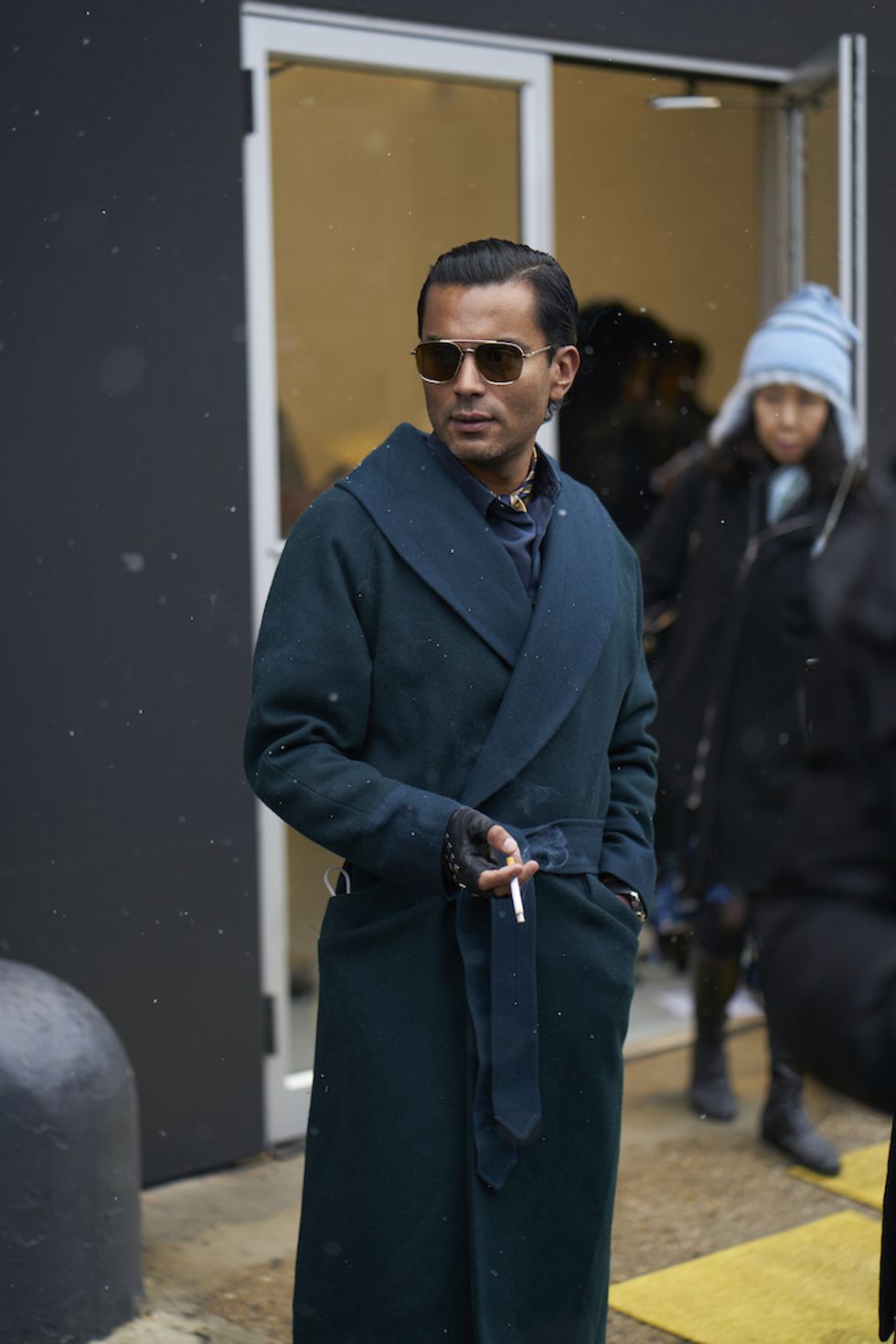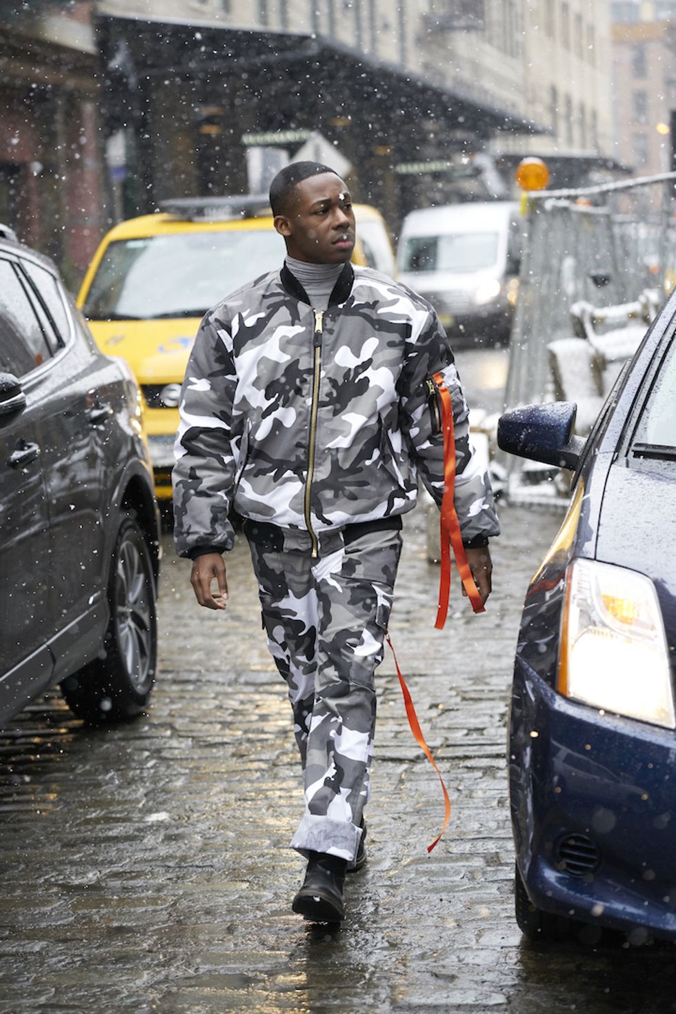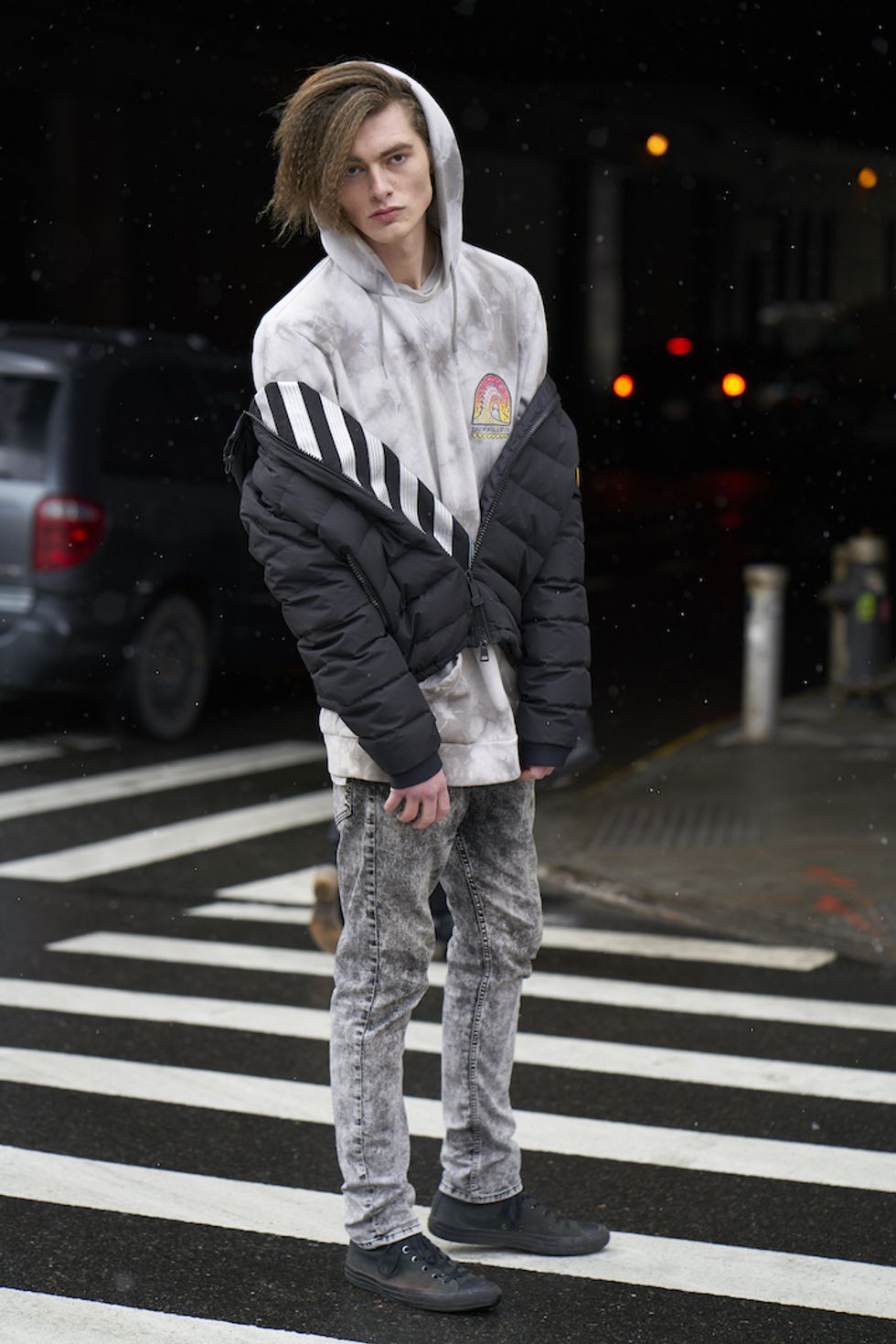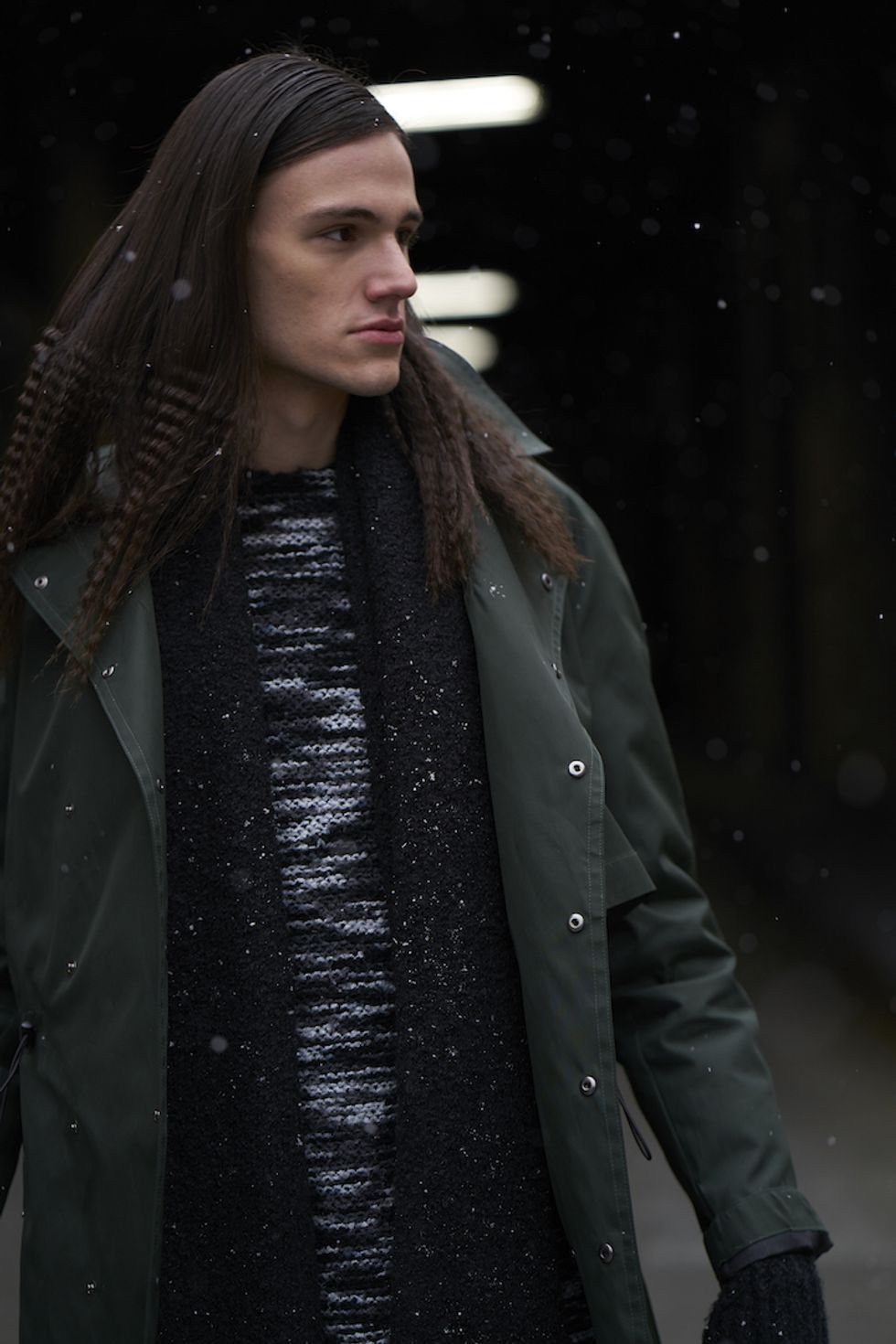 Men's Fashion Week came and went! It's a very special time of year in New York, when the genetically-blessed males of the species hit the streets en masse to flaunt their cheekbones, scowl handsomely, and test out whether or not their most outlandish hairstyles and accessories are "a thing." We braved the cold and snow to document these magnificent creatures in the wild, and divine the trends that the menswear vanguard will be rocking in 2017. We're seeing lots of faux fur, lots of real fur, western hats, head-to-toe monochrome looks, John Hughes movie realness, and in one instance, fishnet stockings.