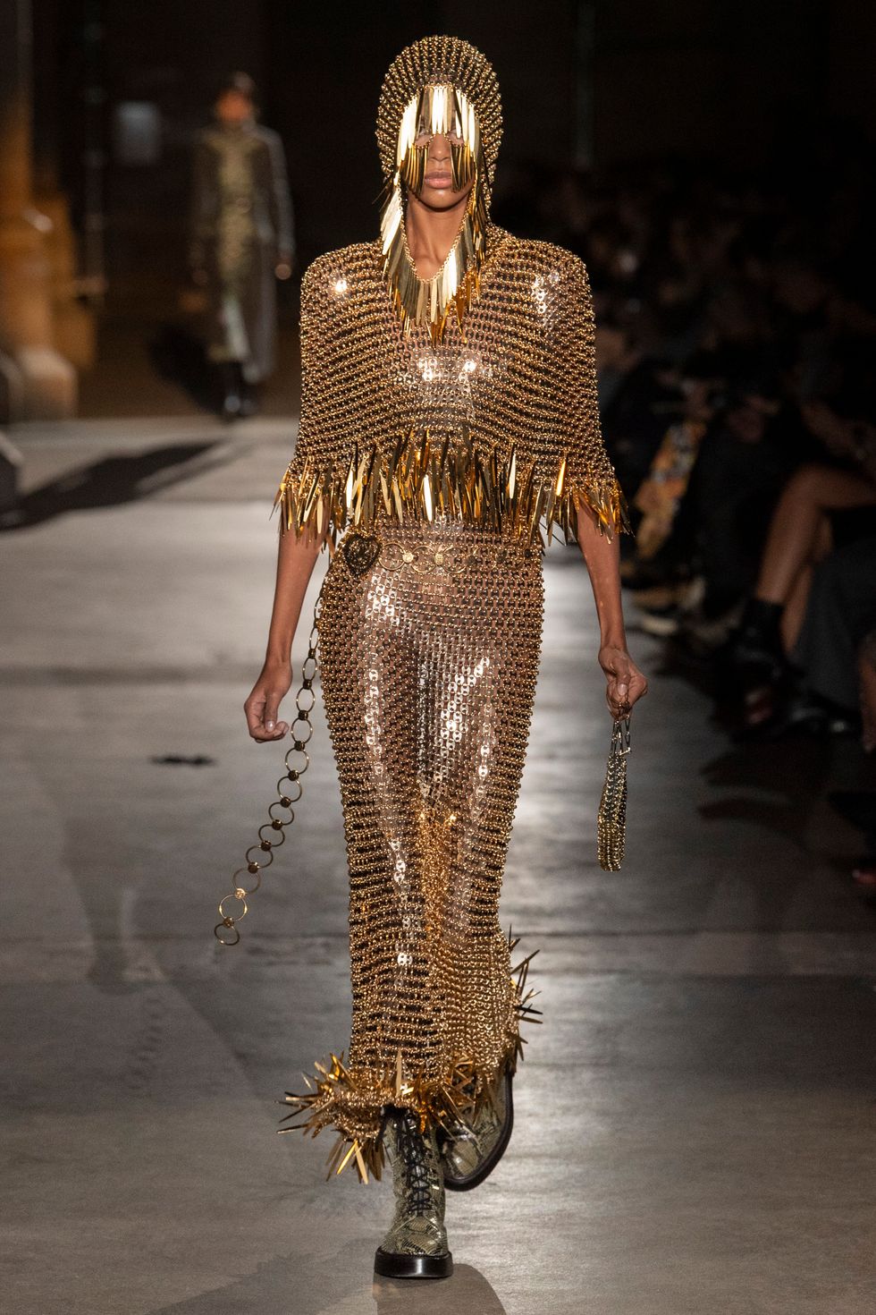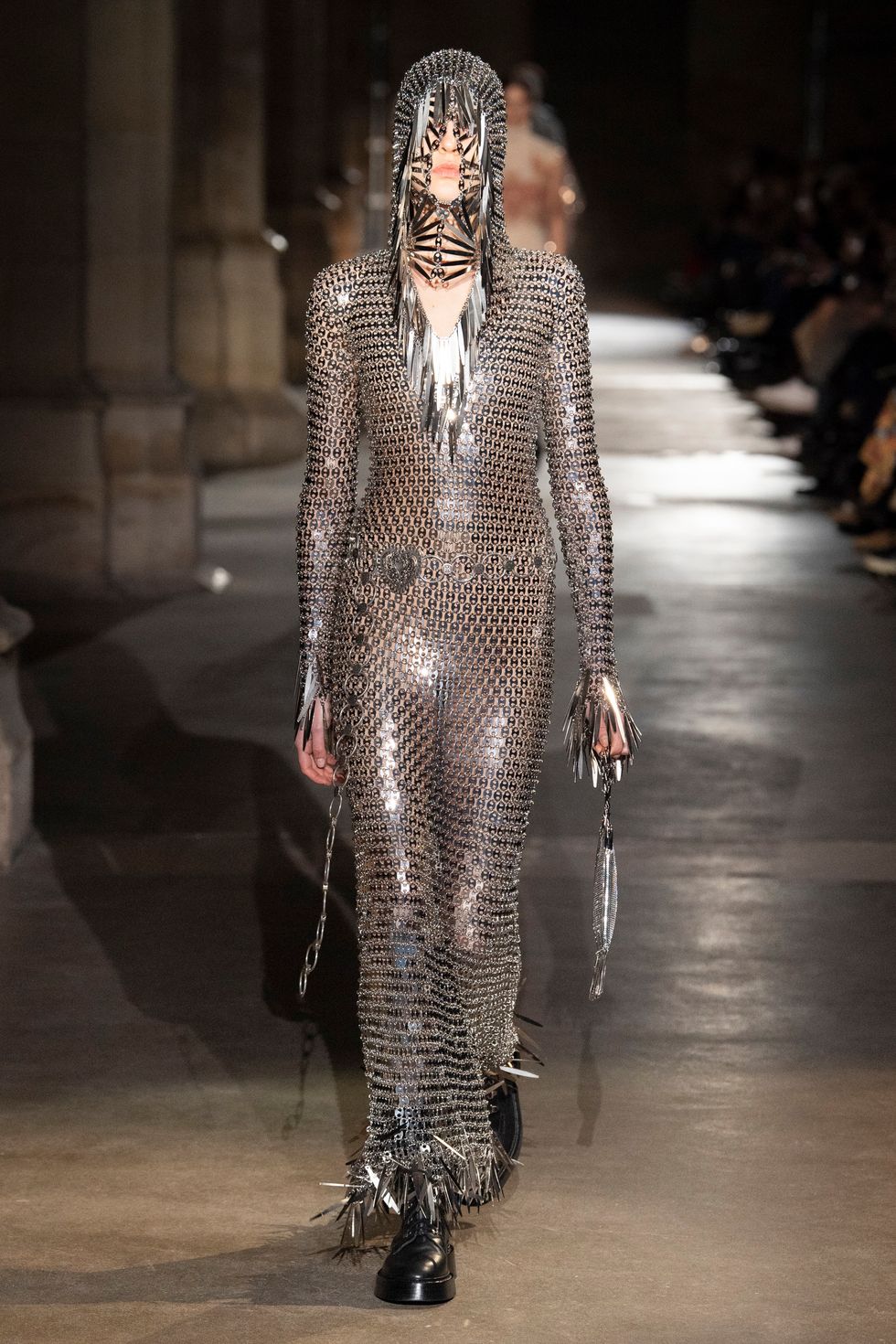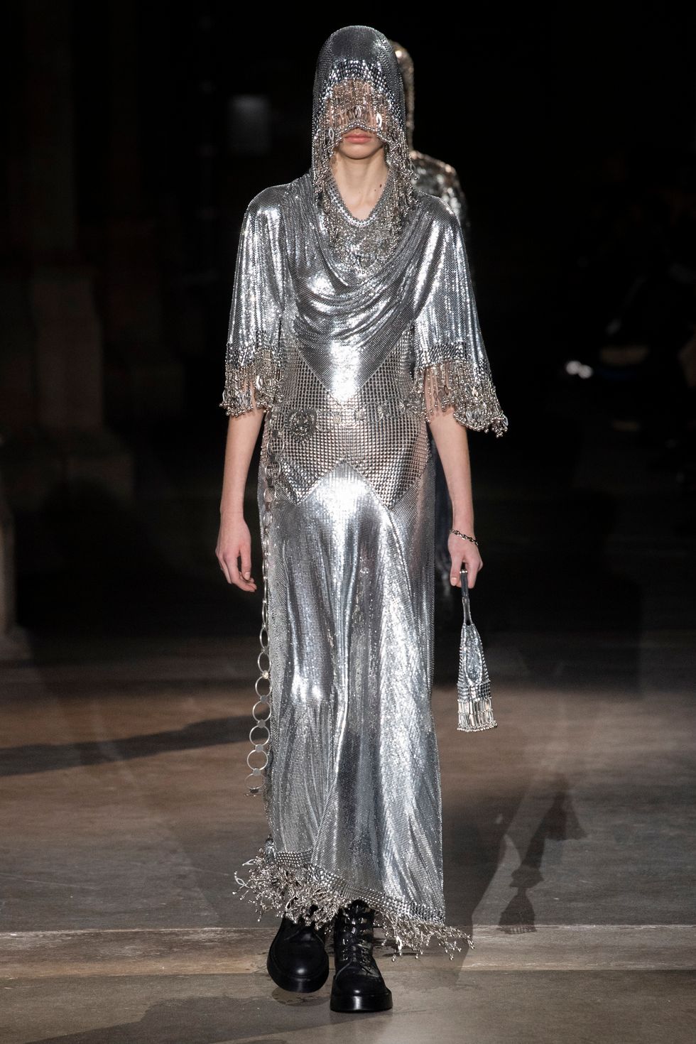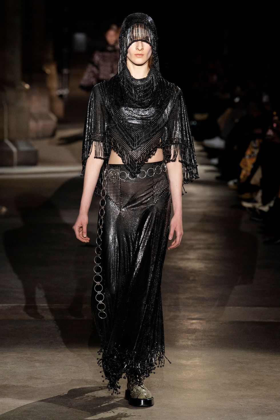 But it was the chainmail headgear and embroidered hoods that really encapsulated the somber, almost mythical mood of the show. Meanwhile, the metal belts and exaggerated platform boots grounded the collection with a strong punk edge that takes these clothes from the medieval to the 21st century. See, below, for more photos from Paco Rabanne Fall 2020.