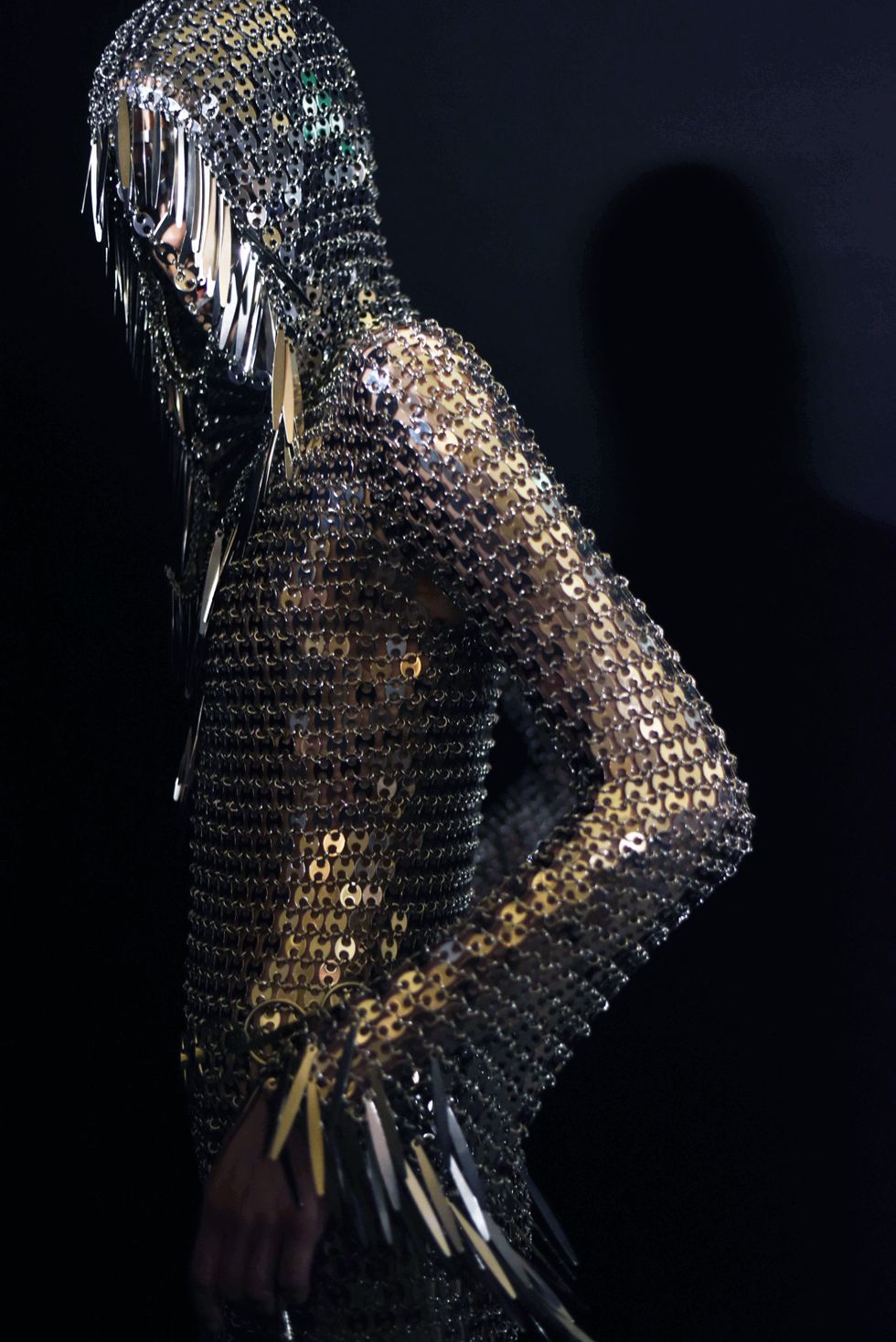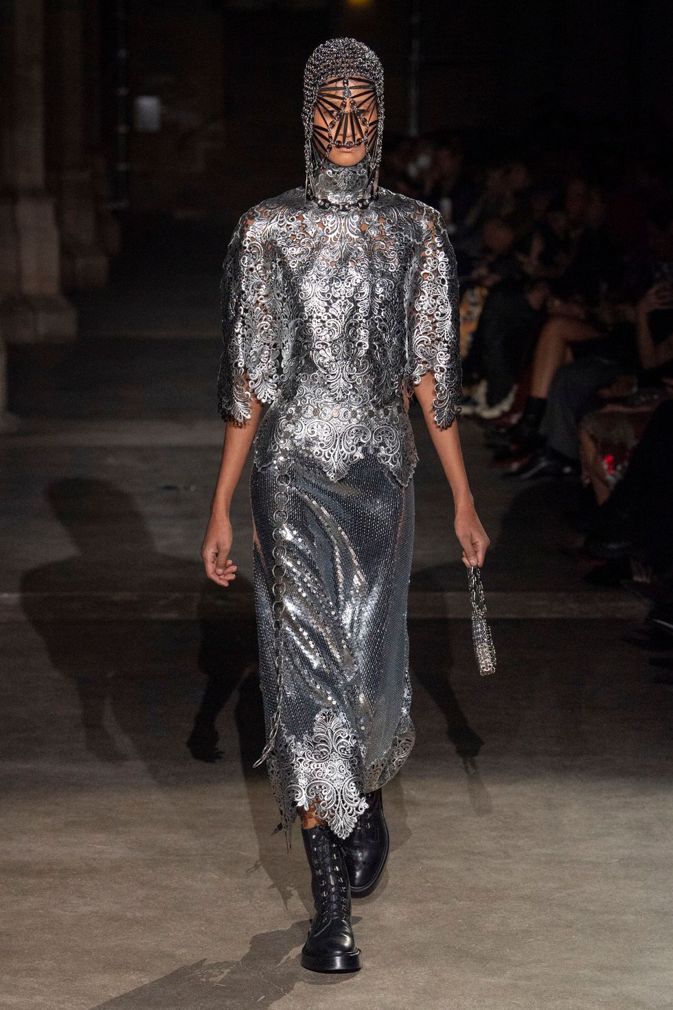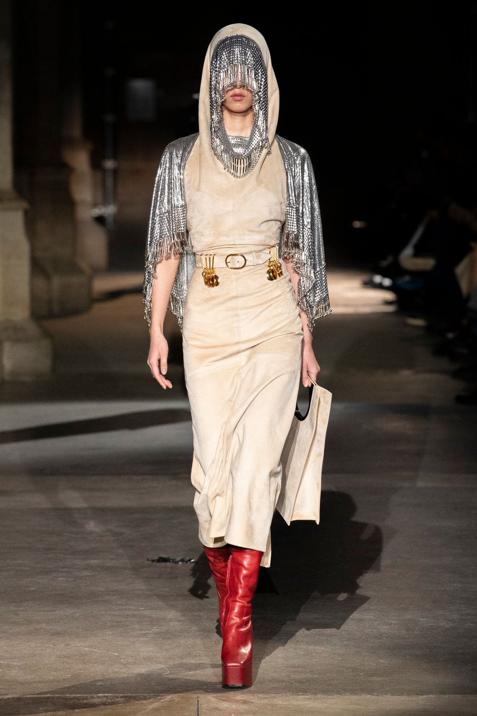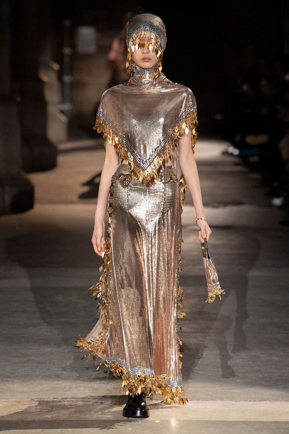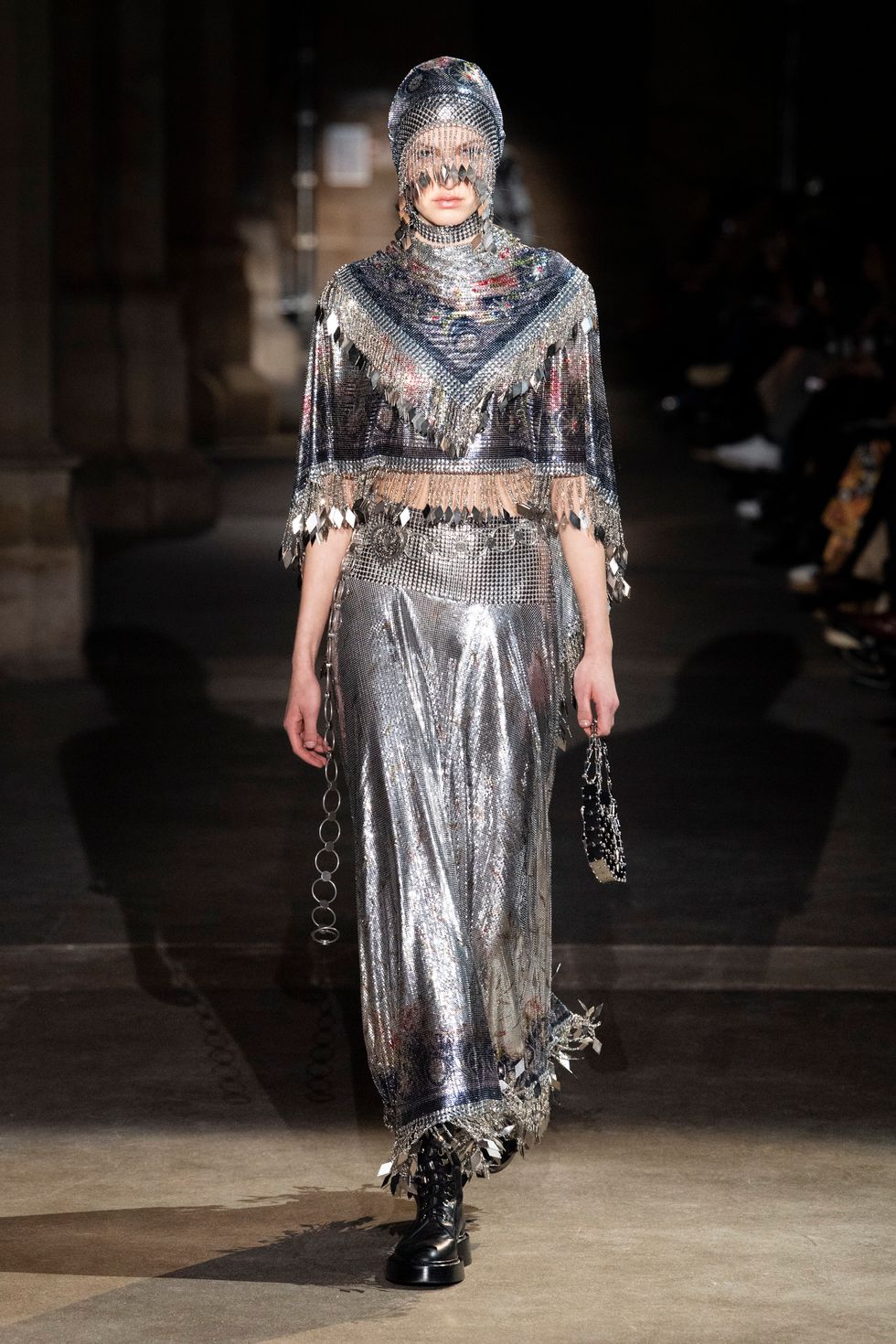 But it was the chainmail headgear and embroidered hoods that really encapsulated the somber, almost mythical mood of the show. Meanwhile, the metal belts and exaggerated platform boots grounded the collection with a strong punk edge that takes these clothes from the medieval to the 21st century. See, below, for more photos from Paco Rabanne Fall 2020.