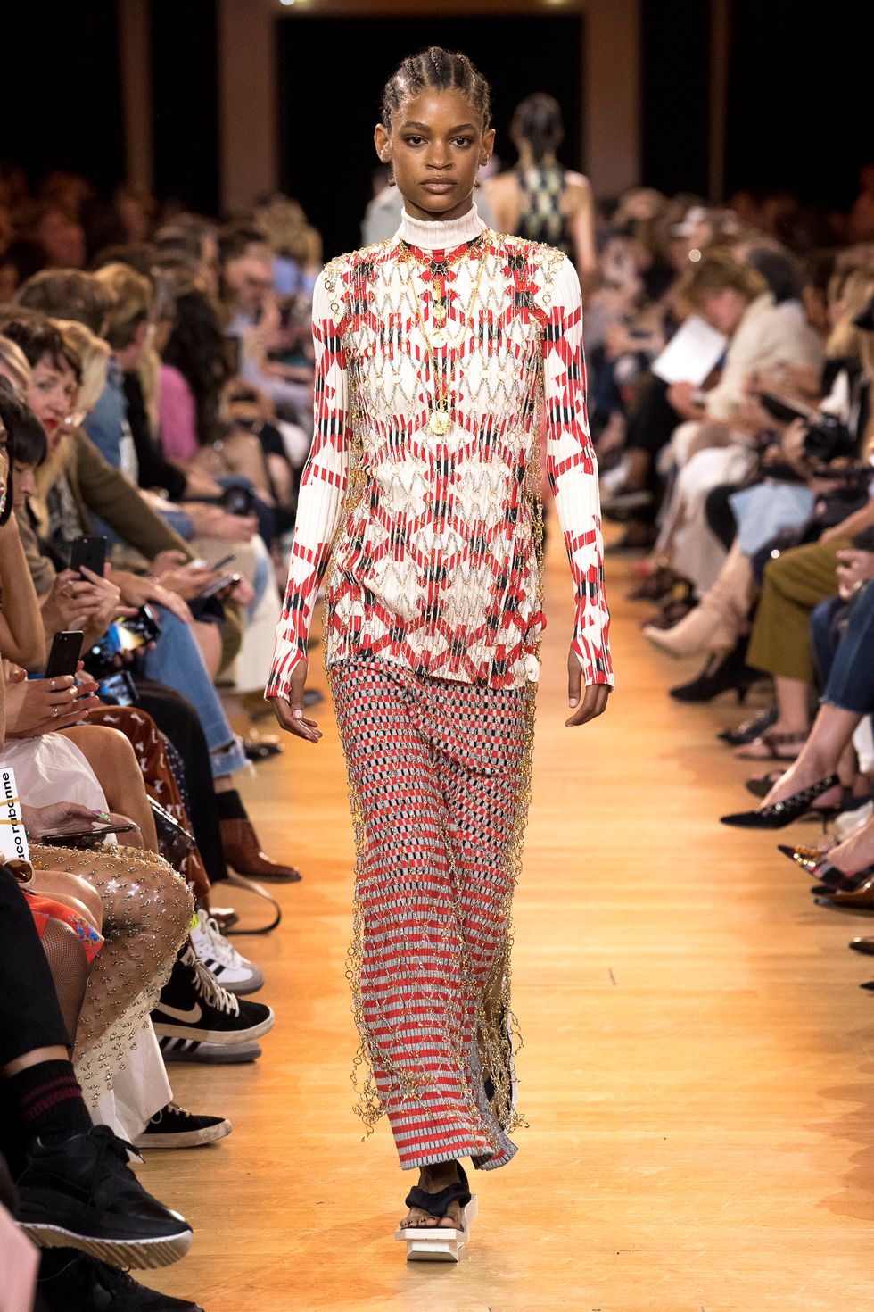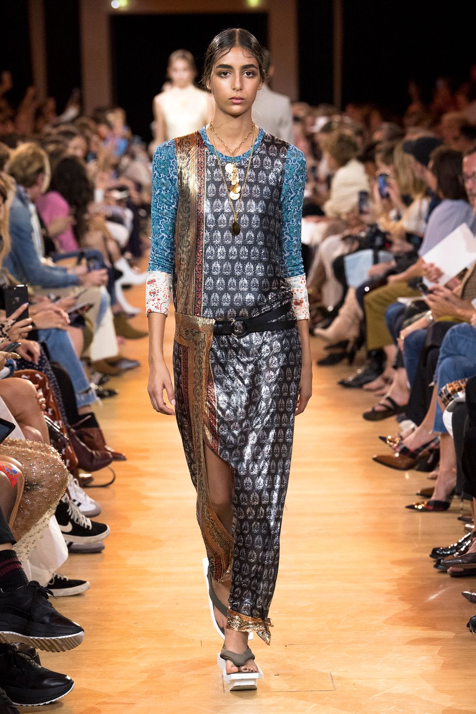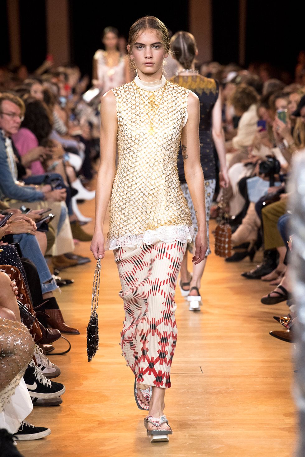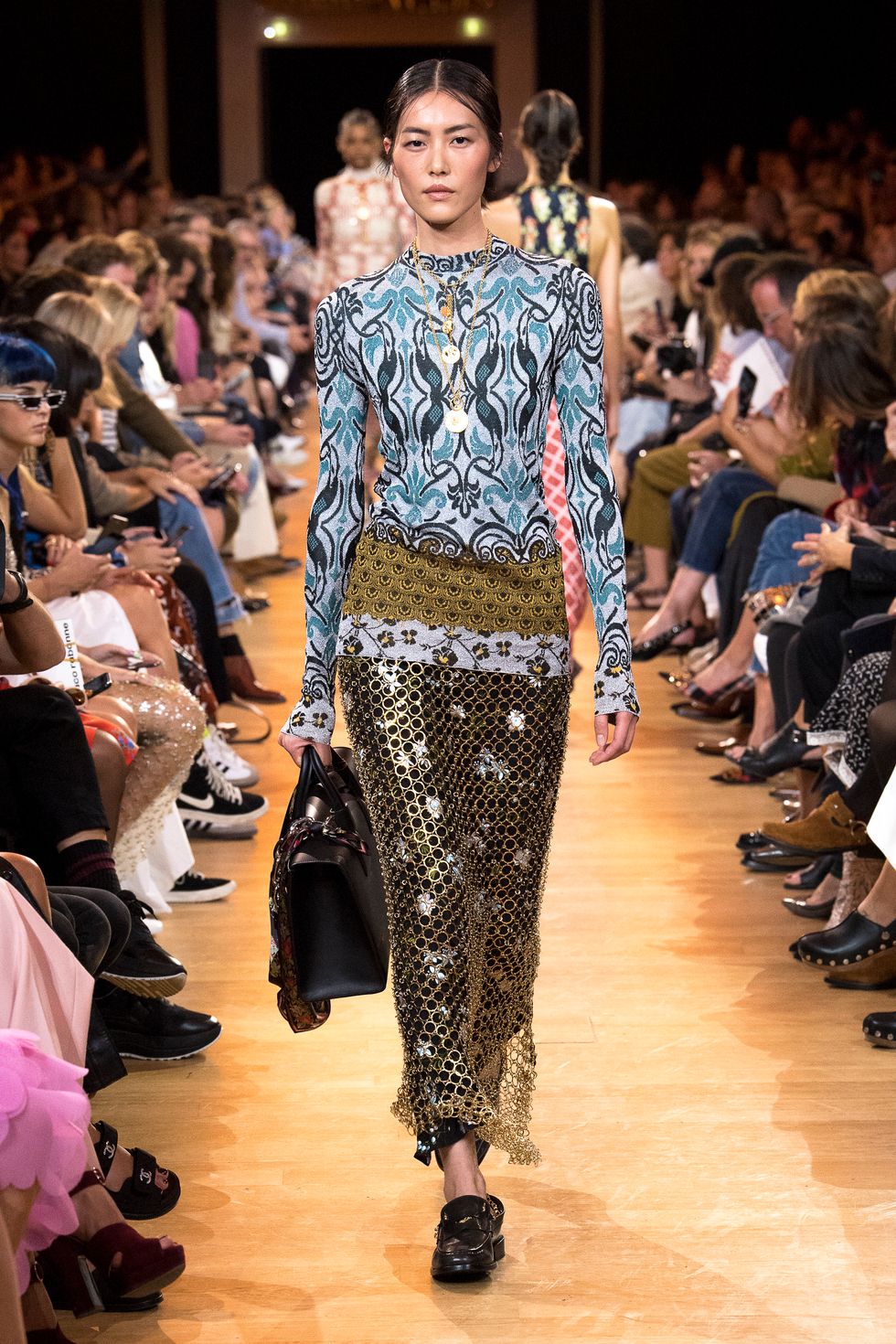 Paco Rabanne is known for its signature chain-link material fashioned into slinky ensembles and futuristic accessories. In his spring 2019 collection for the 52-year-old label, creative director Julien Dossena cut that characteristic mod sexiness with Victorian wallpaper florals, elaborate paisley, and extravagant brocade. Chainmail, crafted into dresses, apron skirts, camisoles, adopted the patterns and tonality of these materials, giving it a decadent, dandy vibes.