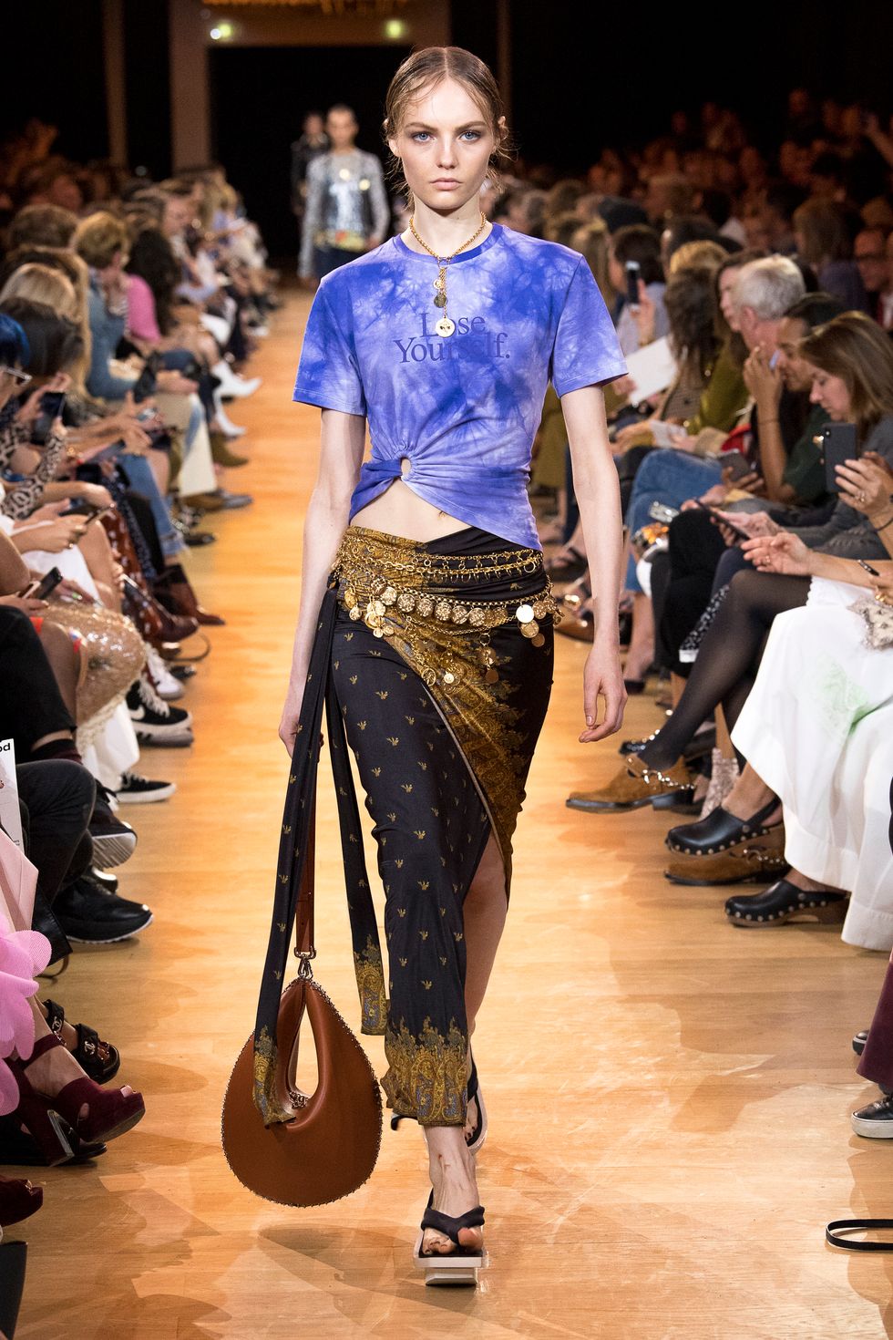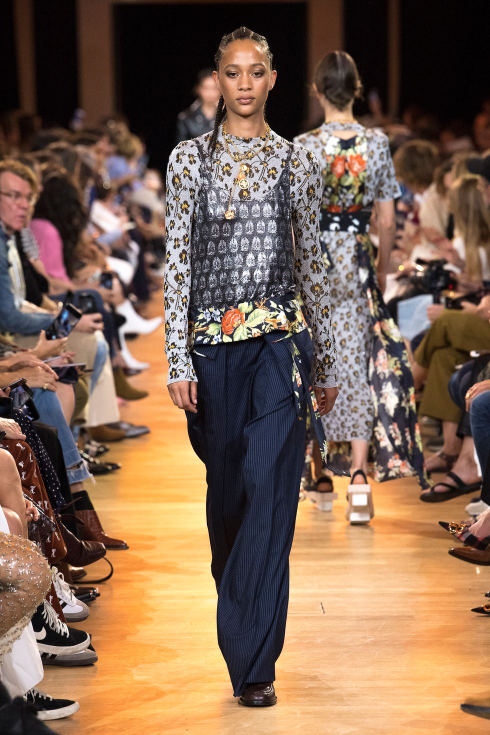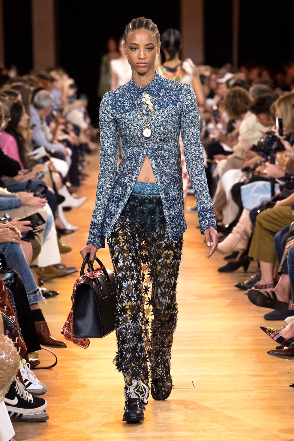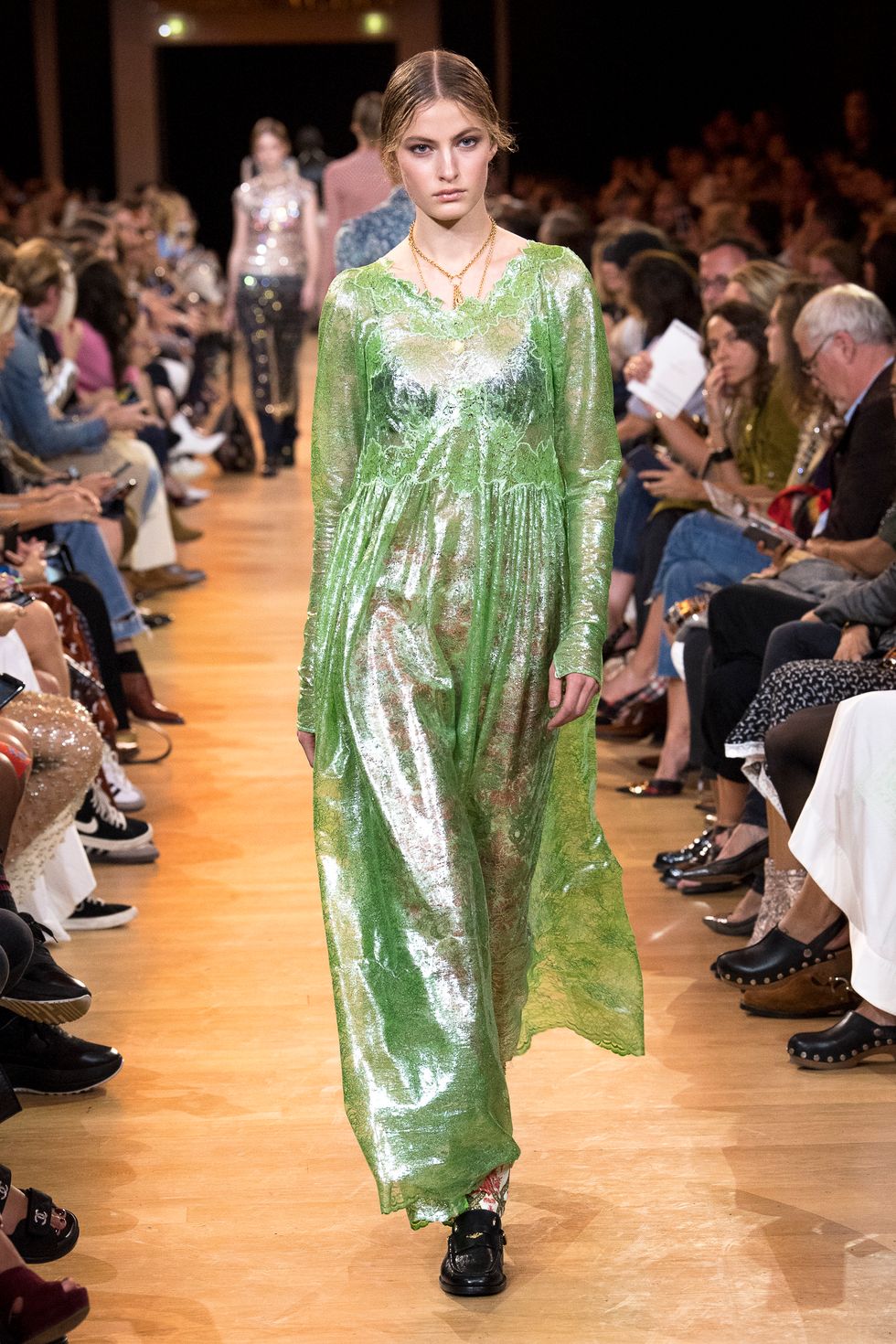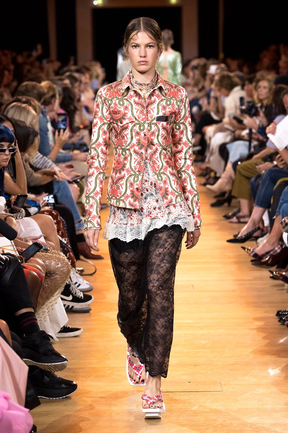 Paco Rabanne is known for its signature chain-link material fashioned into slinky ensembles and futuristic accessories. In his spring 2019 collection for the 52-year-old label, creative director Julien Dossena cut that characteristic mod sexiness with Victorian wallpaper florals, elaborate paisley, and extravagant brocade. Chainmail, crafted into dresses, apron skirts, camisoles, adopted the patterns and tonality of these materials, giving it a decadent, dandy vibes.