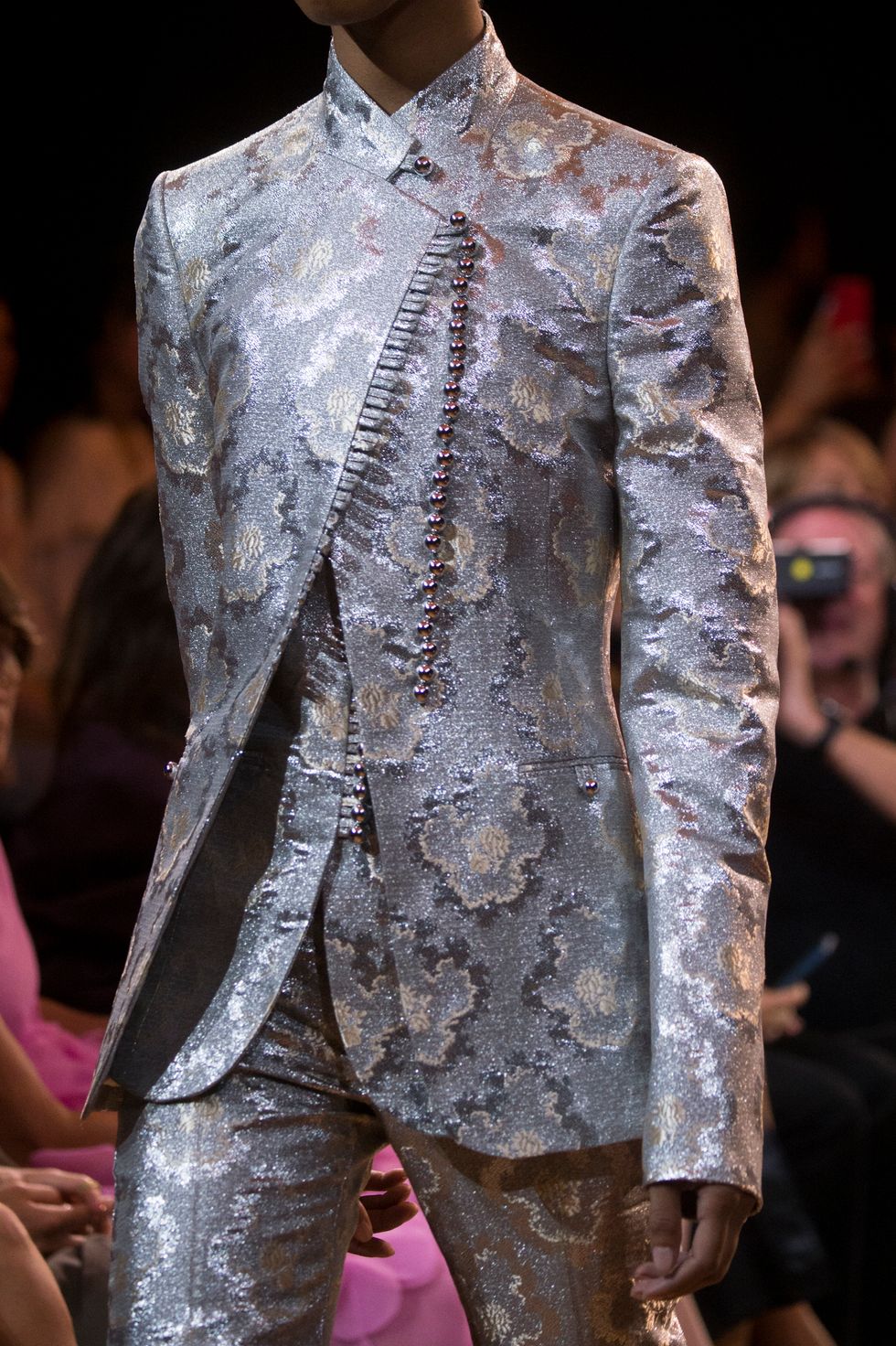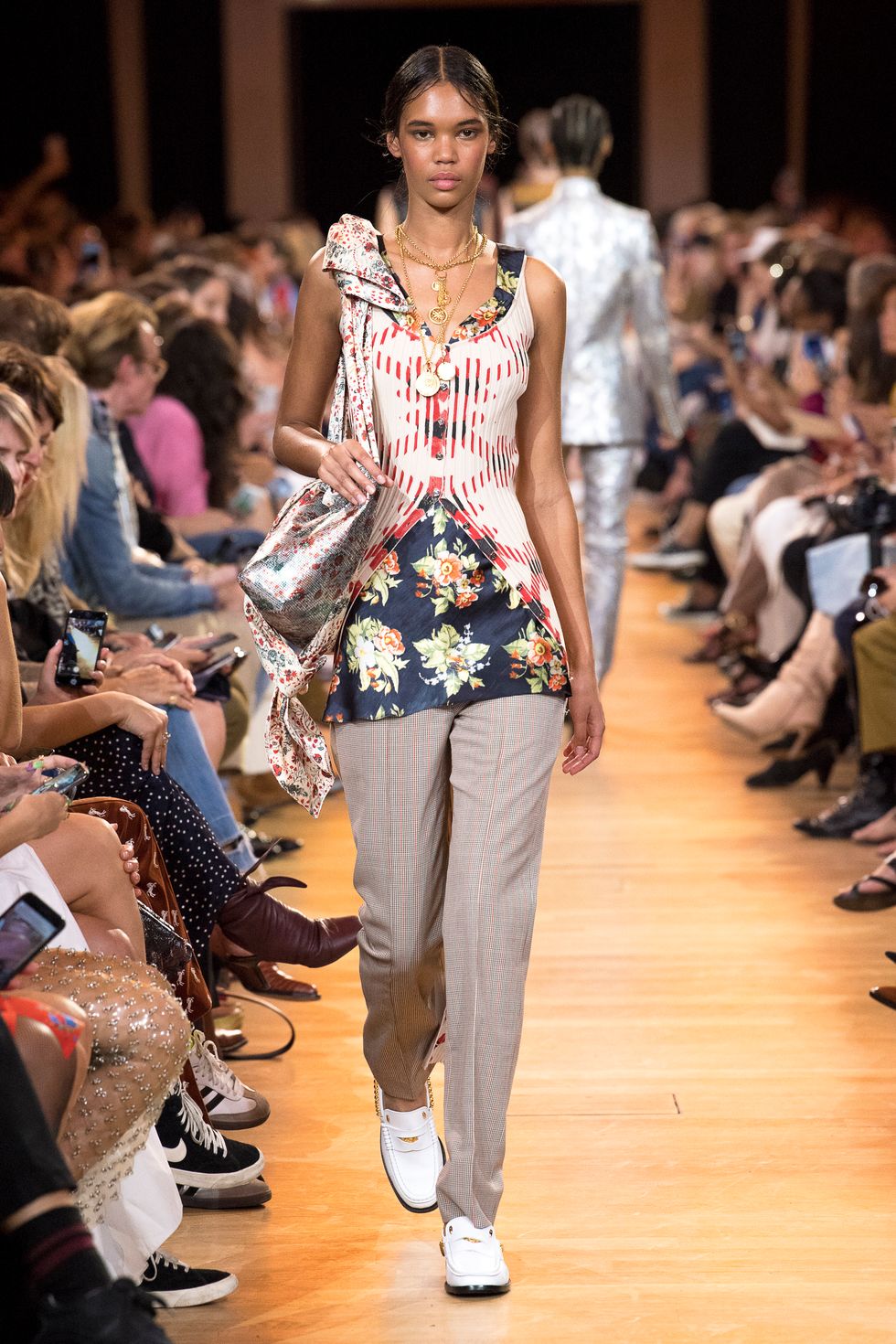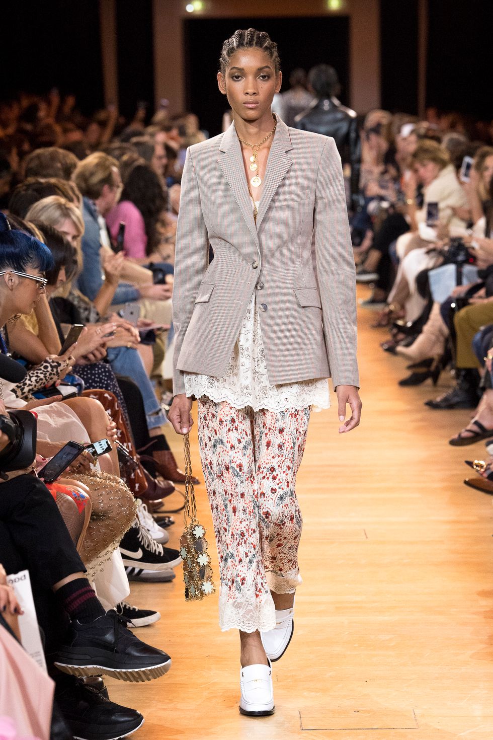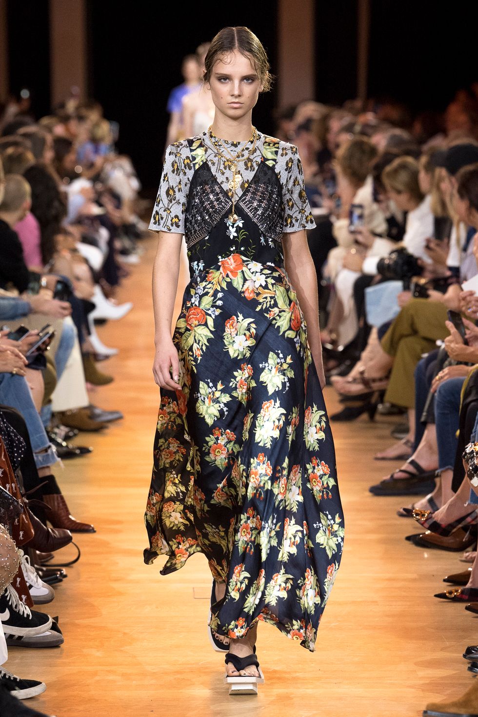 Paco Rabanne is known for its signature chain-link material fashioned into slinky ensembles and futuristic accessories. In his spring 2019 collection for the 52-year-old label, creative director Julien Dossena cut that characteristic mod sexiness with Victorian wallpaper florals, elaborate paisley, and extravagant brocade. Chainmail, crafted into dresses, apron skirts, camisoles, adopted the patterns and tonality of these materials, giving it a decadent, dandy vibes.