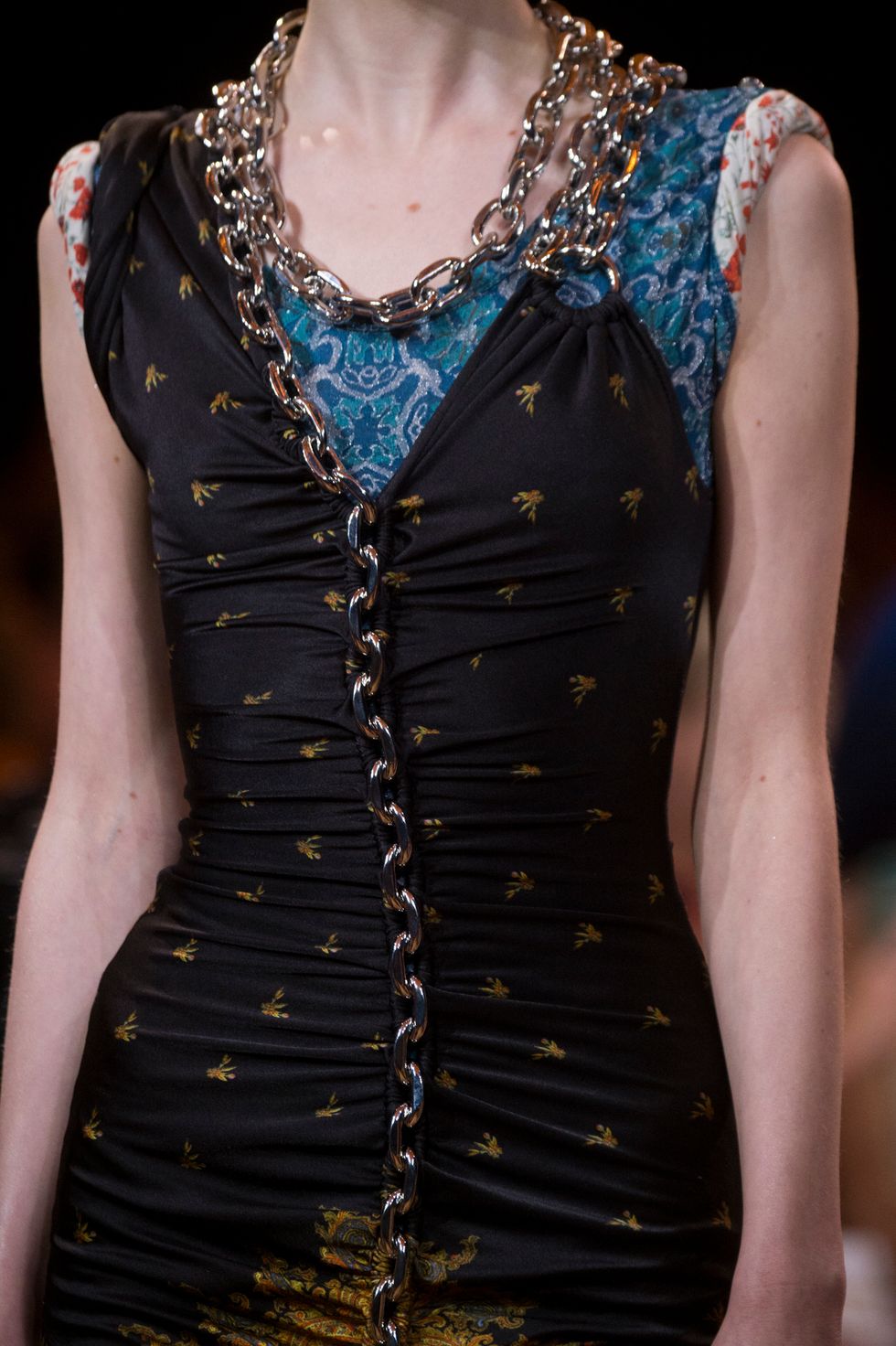Chains, used as dress straps, necklaces, and trimmings on seams and necklines, brought industrial weight to delicate fabrics. Elsewhere, spherical buttons (sometimes more than 20 in a row) made decorative fabrics a smidge grungy.