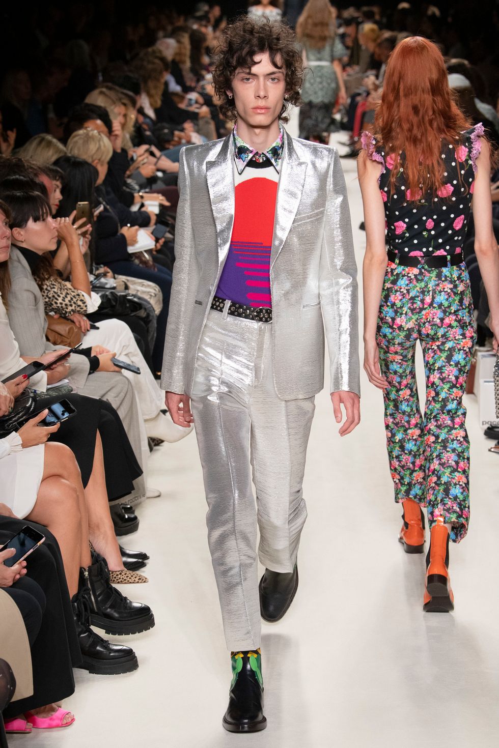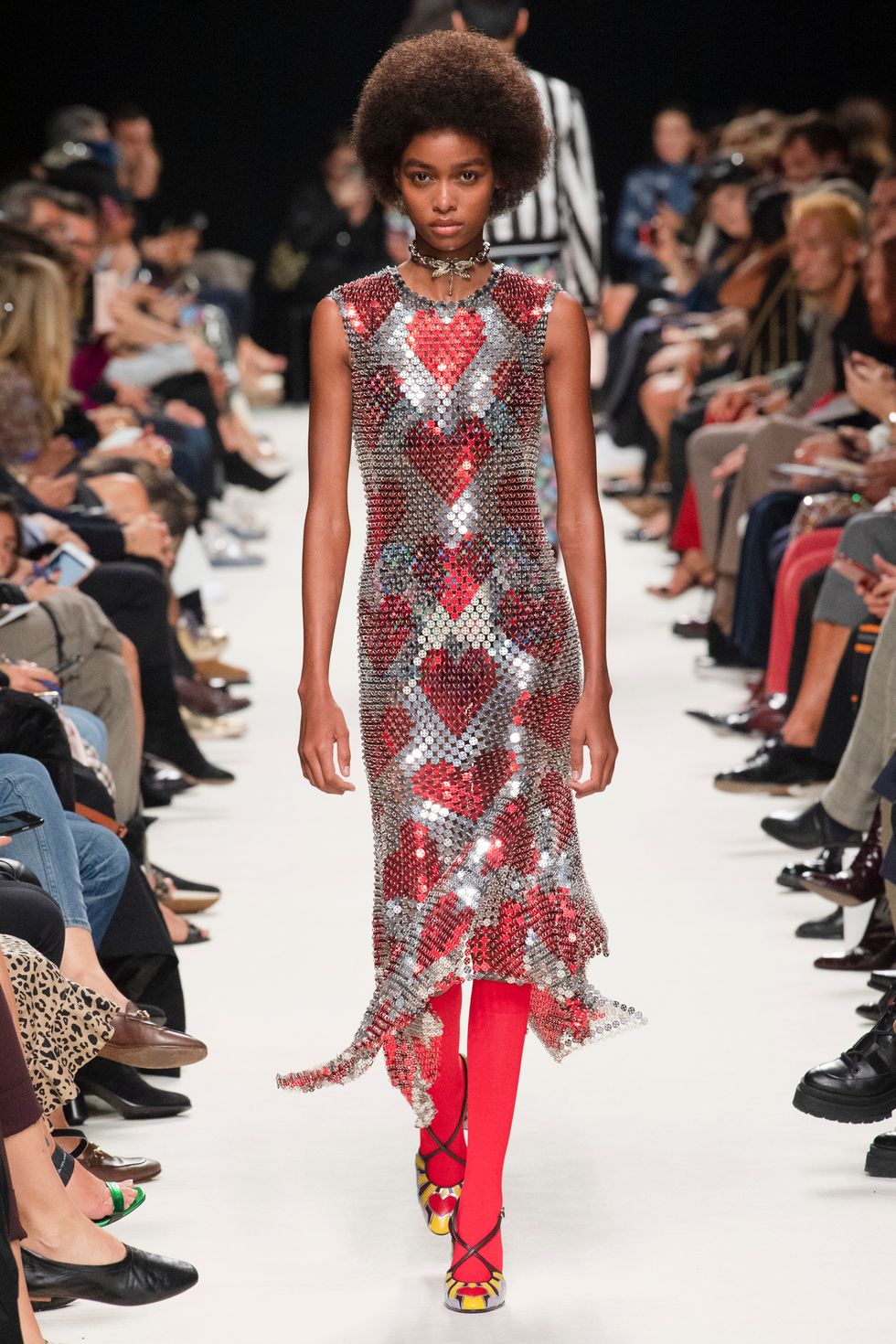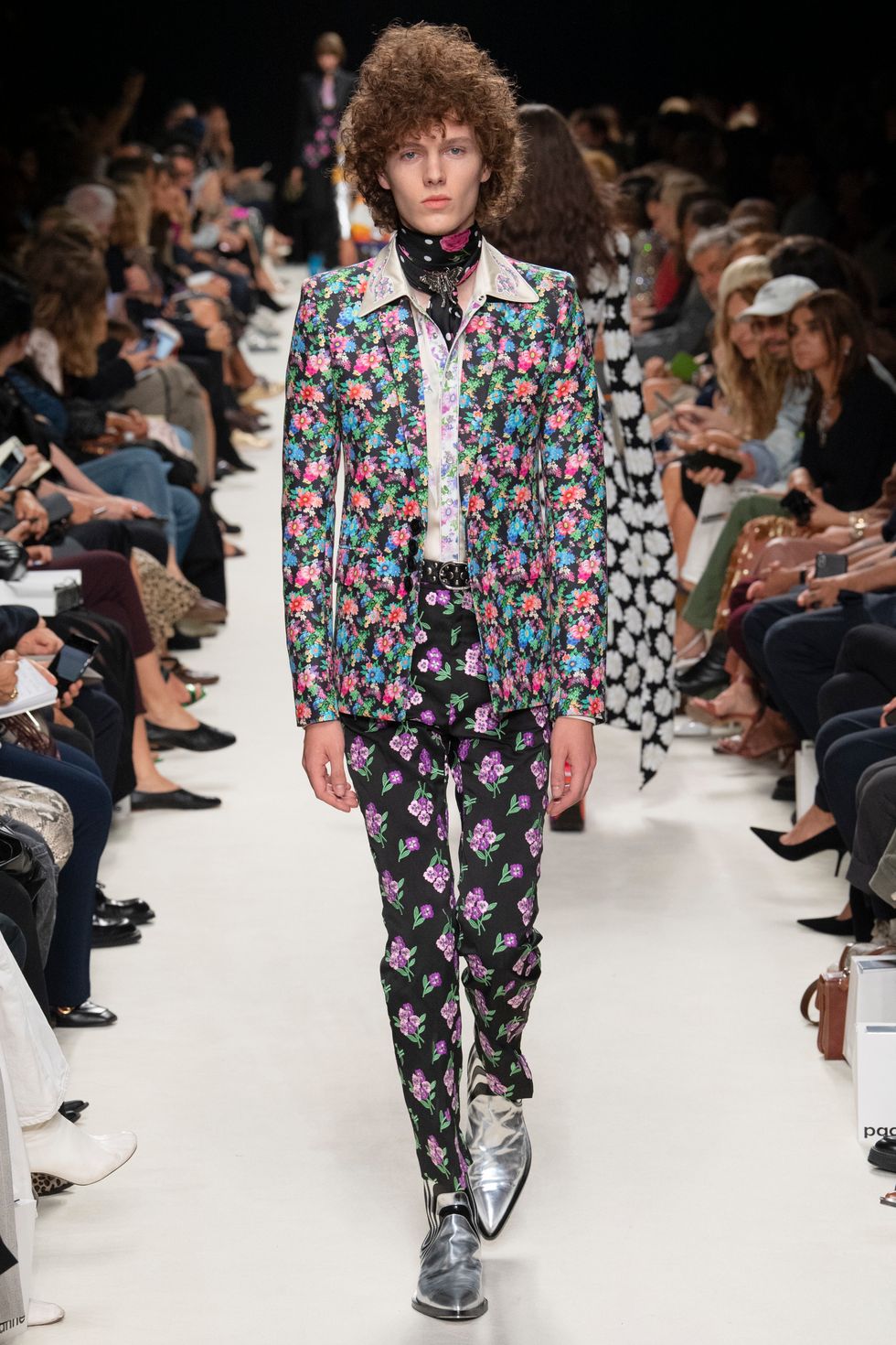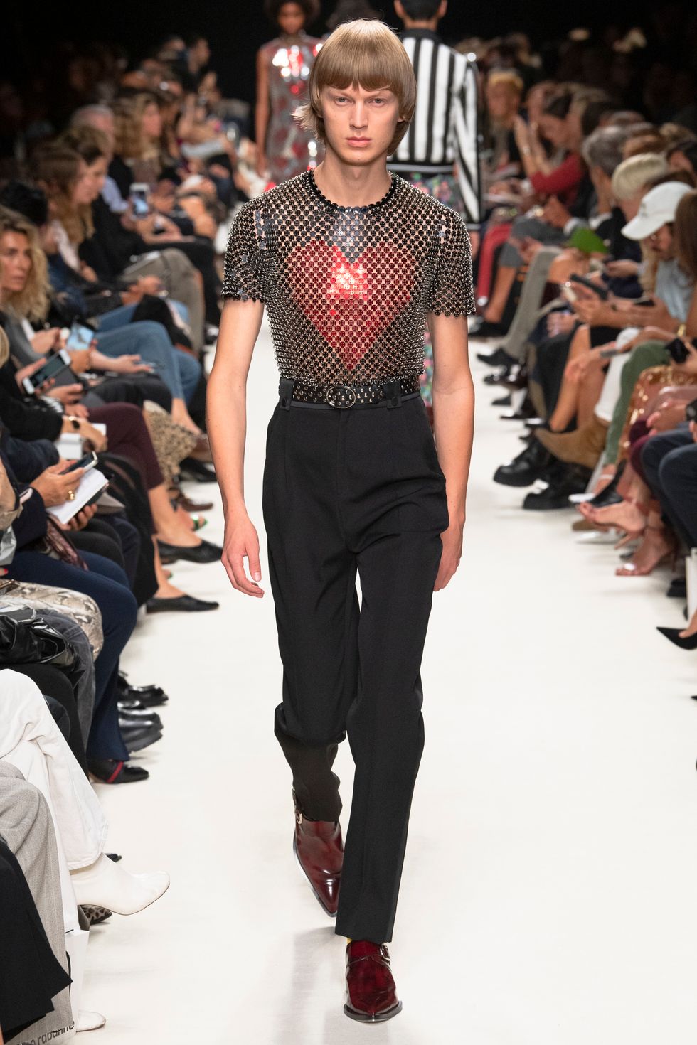 At Paco Rabanne's show in Paris today, Creative Director Julien Dossena introduced menswear on the runway for the first time. The male models sported sleek tailoring in shiny fabrics, colorful prints, and retro hairstyles that vibed well with the women's offering. As a whole, the collection leaned big into '60s and '70s references, prints of hearts and daisies, and its signature metal mesh and chain links. Here's everything else you need to know about the collection.
