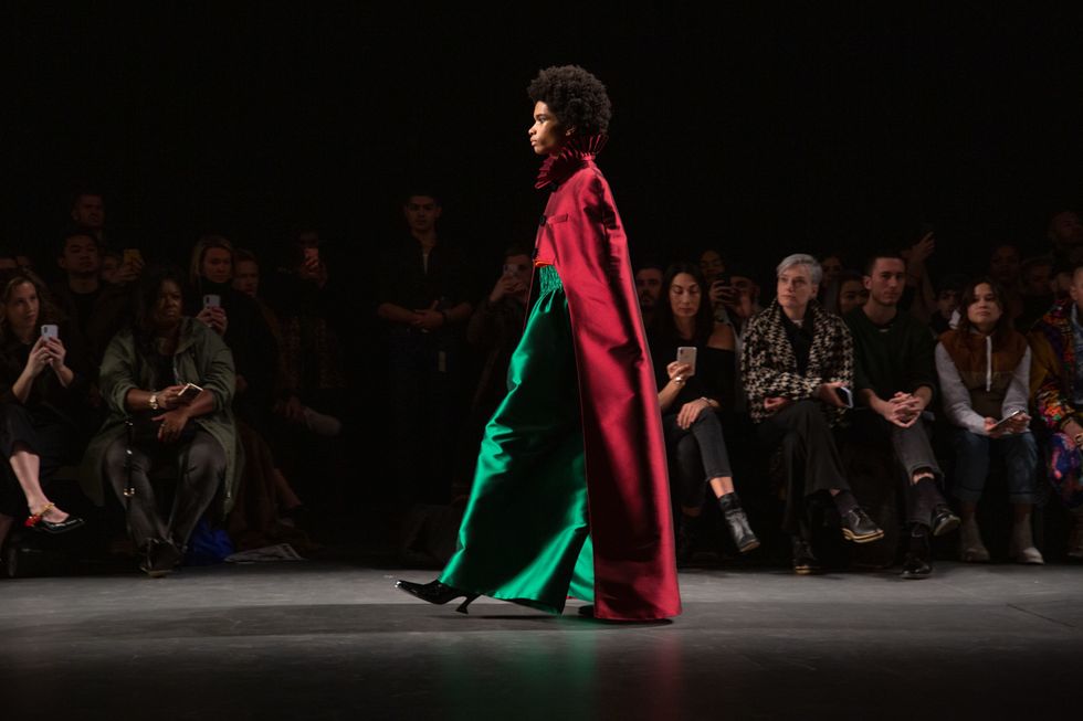 Look 23: an explosion of color on the runway. A deep red cape with a ruff-inspired collar (a Victorian article of clothing worn by men and women, which ruffled around the neck) was worn over a pair of high waisted emerald-hued pants and purple opera gloves. An orange turtleneck peeked out from under the cape.