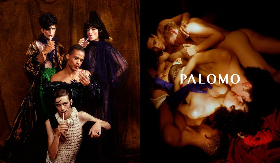 A key source inspiration for the 1916 collection was Serguei Diaguilev's Ballet Russes and its influence on Spain. For its corresponding campaign, created by Berlin-based artist Matt Lambert, these romantic ideas were revised through a distinctly queer lens. The resulting images are works of art that you might see in a museum, showing the unconstrained Palomo Spain man entwined in the bodies of another.