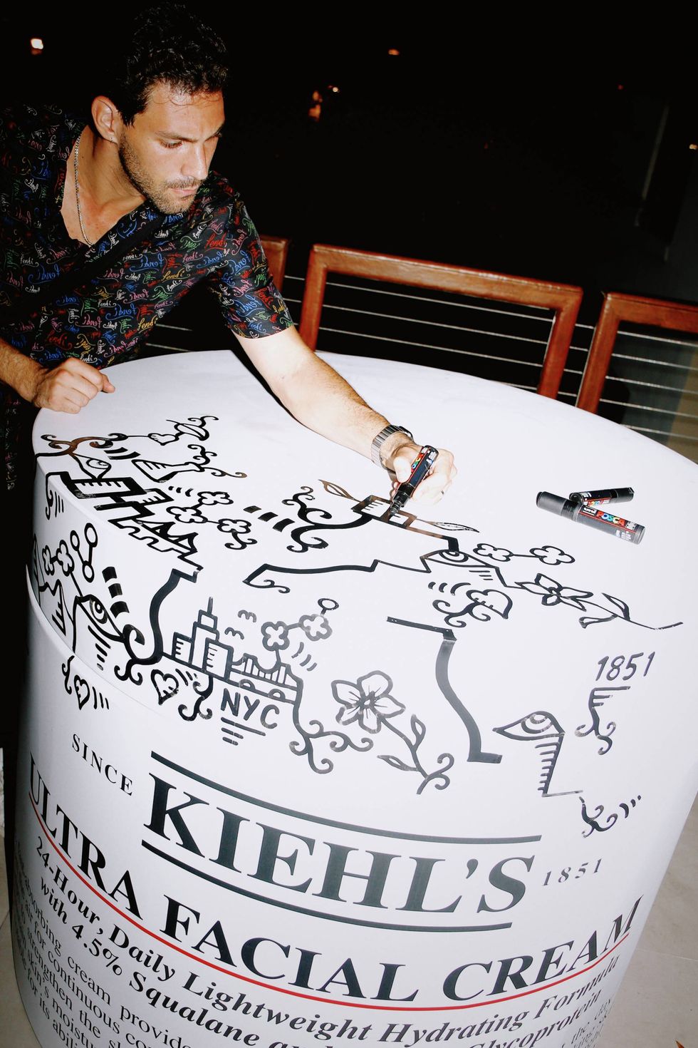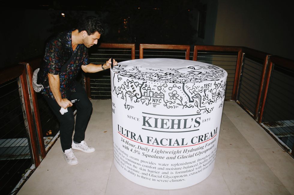 When guests needed to cool off from twirling, they kept hydrated with sips of curated cocktails from Centinela Tequila, Bates Gin, Beast Vodka, and Sonrisa Rum — all while sitting around to watch as visual artist, illustrator, and muralist Alex Alpert painted a life-size version of a jar of Kiehl’s Ultra Facial Cream. Staying true to the spirit of Miami Art Week, this installation treated guests to a one-of-a-kind, in-person art experience, welcoming all attendees into an artist’s step-by-step process as Alpert slowly but surely turned what started as the familiar plain white cabinet staple into a gloriously vivid, graffiti-inspired creation. It was pop art perfection.